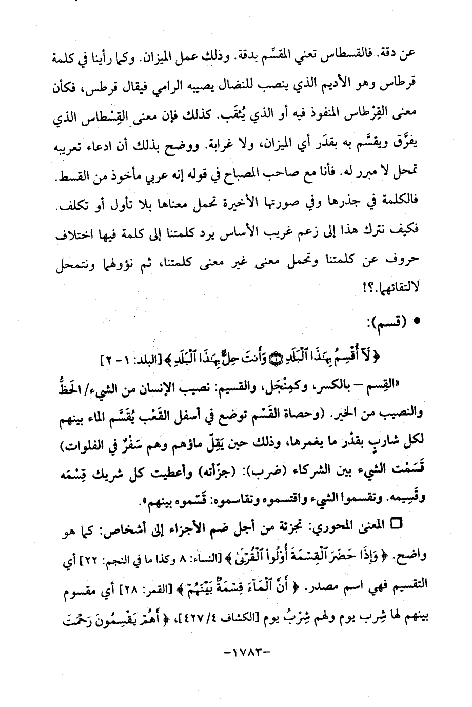 عن دقة. فالقسطاس تعني المقسِّم بدقة. وذلك عمل الميزان. وكما رأينا في كلمة قرطاس وهو الأديم الذي ينصب للنضال يصيبه الرامي فيقال قرطس، فكأن معنى القِرْطاس المنفوذ فيه أو الذي يُثقَب. كلذلك فإن معنى القِسْطاس الذي يفرَّق ويقسَّم به بقدَر أي الميزان، ولا غرابة. ووضح بذلك أن ادعاء تعريبه تمحل لا مبرر له. فأنا مع صاحب المصباح في قوله إنه عربي مأخوذ من القسط. فالكلمة في جذرها وفي صورتها الأخيرة تحمل معناها بلا تأول أو تكلف. فكيف نترك هذا إلى زعم غريب الأساس يرد كلمتنا إلى كلمة فيها اختلاف حروف عن كلمتنا وتحمل معنى غير معنى كلمتنا، ثم نؤولهما ونتمحل لالتقائهما.؟!