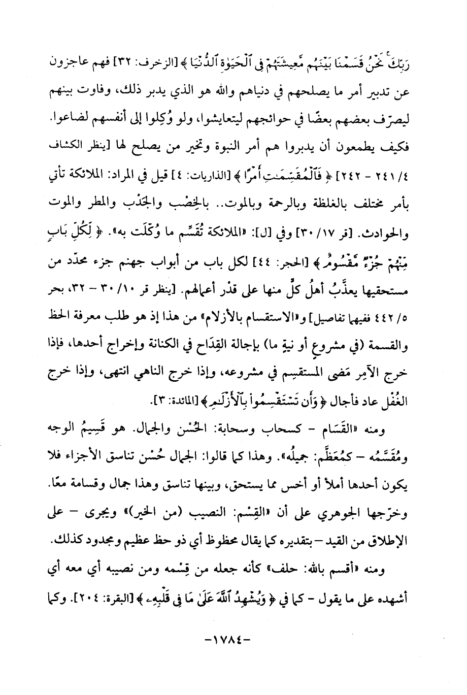رَبِّكَ نَحْنُ قَسَمْنَا بَيْنَهُمْ مَعِيشَتَهُمْ فِي الْحَيَاةِ الدُّنْيَا} [الزخرف: 32] فهم عاجزون عن تدبير أمر ما يصلحهم في دنياهم والله هو الذي يدبر ذلك، وفاوت بينهم ليصرّف بعضهم بعضًا في حوائجهم ليتعايشوا، ولو وُكِلوا إلى أنفسهم لضاعوا. فكيف يطمعون أن يدبروا هم أمر النبوة وتخير من يصلح لها [ينظر الكشاف 4/ 241 - 242] {فَالْمُقَسِّمَاتِ أَمْرًا} [الذاريات: 4] قيل في المراد: الملائكة تأتي بأمر مختلف بالغلظة وبالرحمة وبالموت .. بالخِصْب والجَدْب والمطر والموت والحوادث. [قر 17/ 30] وفي [ل]: "الملائكة تُقَسِّم ما وُكّلَت به ". {لِكُلِّ بَابٍ مِنْهُمْ جُزْءٌ مَقْسُومٌ} [الحجر: 44] لكل باب من أبواب جهنم جزء محدّد من مستحقيها يعذَّبُ أهلُ كلٍّ منها على قدْر أعمالهم. [ينظر قر 10/ 30 - 32, بحر 5/ 442 ففيهما تفاصيل] و "الاستقسام بالأزلام "من هذا إذ هو طلب معرفة الحظ والقسمة (في مشروعٍ أو نيةٍ ما) بإجالة القِدَاح في الكنانة وإخراج أحدها، فإذا خرج الآمِر مَضى المستقسِم في مشروعه، وإذا خرج الناهي انتهى، وإذا خرج الغُفْل عاد فأجال {وَأَنْ تَسْتَقْسِمُوا بِالْأَزْلَامِ} [المائدة: 3].
