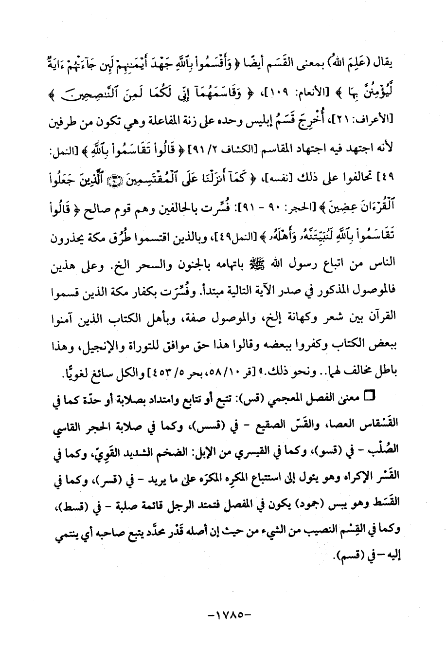 يقال (عَلِمَ اللهُ) بمعنى القَسَم أيضًا {وَأَقْسَمُوا بِاللَّهِ جَهْدَ أَيْمَانِهِمْ لَئِنْ جَاءَتْهُمْ آيَةٌ لَيُؤْمِنُنَّ بِهَا} [الأنعام: 109]، {وَقَاسَمَهُمَا إِنِّي لَكُمَا لَمِنَ النَّاصِحِينَ} [الأعراف: 21]، أُخْرِجَ قَسَمُ إبليس وحده على زنة المفاعلة وهي تكون من طرفين لأنه اجتهد فيه اجتهاد المقاسم [الكشاف 2/ 91] {قَالُوا تَقَاسَمُوا بِاللَّهِ} [النمل: 49] تحالفوا على ذلك [نفسه]، {كَمَا أَنْزَلْنَا عَلَى الْمُقْتَسِمِينَ (90) الَّذِينَ جَعَلُوا الْقُرْآنَ عِضِينَ} [الحجر: 90, 91]: فُسِّرت بالحالفين وهم قوم صالح {قَالُوا تَقَاسَمُوا بِاللَّهِ لَنُبَيِّتَنَّهُ وَأَهْلَهُ} [النمل: 49]، وبالذين اقتسموا طُرُق مكة يحذرون الناس من اتباع رسول الله - صلى الله عليه وسلم - باتهامه بالجنون والسحر الخ. وعلى هذين فالموصول المذكور في صدر الآية التالية مبتدأ. وفُسِّرَت بكفار مكة الذين قسموا القرآن بين شعر وكهانة إلخ، والموصول صفة، وبأهل الكتاب الذين آمنوا ببعض الكتاب وكفروا ببعضه وقالوا هذا حق موافق للتوراة والإنجيل، وهذا باطل مخالف لهما .. ونحو ذلك ". [قر 10/ 58، بحر 5/ 453] والكل سائغ لغويًّا.