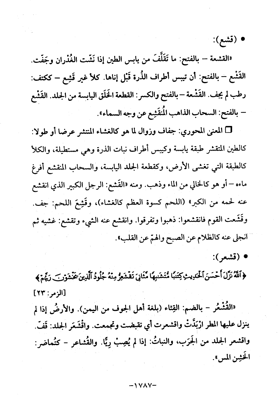 "القُشْعُر - بالضم: القِثاء (بلغة أهل الجوف من اليمن). والأرضُ إذا لم ينزل عليها المطر ارْبَدَّتْ واقشعرت أي تقبضت وتجمعت. واقْشَعَر الجلد: قَفّ. واقشعر الجلد من الجَرَب، والنباتُ: إذا لم يُصِبْ رِيًّا. والقُشاعر - كتُماضر: الخَشِن المس ".