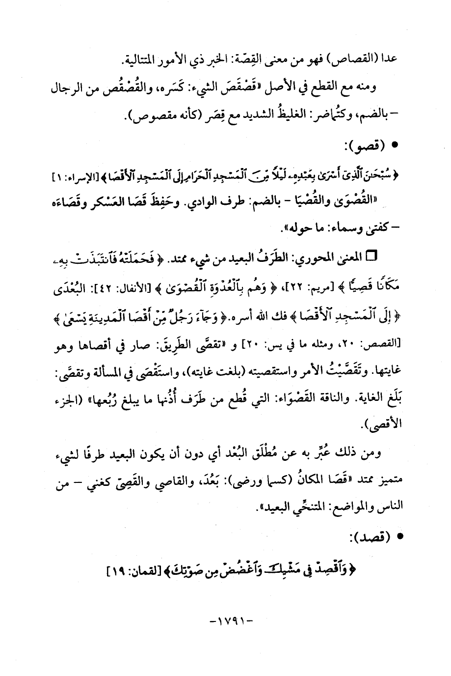 Qالطَرَفُ البعيد من شيء ممتد. {فَحَمَلَتْهُ فَانْتَبَذَتْ بِهِ مَكَانًا قَصِيًّا} [مريم: 22] , {وَهُمْ بِالْعُدْوَةِ الْقُصْوَى} [الأنفال: 42]: البُعْدَى {إِلَى الْمَسْجِدِ الْأَقْصَى} فك الله أسره. {وَجَاءَ رَجُلٌ مِنْ أَقْصَى الْمَدِينَةِ يَسْعَى} [القصص: 20، ومثله ما في يس: 20] و "تقصَّى الطَرِيقَ: صار في أقصاها وهو غايتها. وتَقَضَّيْتُ الأمر واستقصيته (بلغت غايته)، واستَقْصَى في المسألة وتقصَّى: بَلَغ الغاية. والناقة القَصْوَاء: التي قُطع من طَرَف أُذُنها ما يبلغ رُبُعها " (الجزء الأقصى).