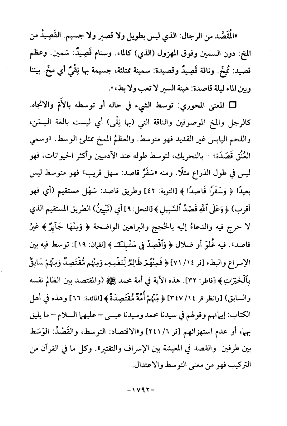 Qتوسط الشيء في حاله أو توسطه بالأَمّ والاتجاه. كالرجل والمخ الموصوفين والناقة التي (بها نِقْى) أي ليست بالغة السِمَن، واللحم اليابس غير القديد فهو متوسط. والعظمُ المخ ممتلئ الوسط. "وسمي العُنُق قَصَدَة "- بالتحريك، لتوسط طوله عند الآدميين وأكثر الحيوانات، فهو ليس في طول الذراع مثلًا. ومنه "سَفَرٌ قاصد: سهل قريب "فهو متوسط ليس بعيدًا {وَسَفَرًا قَاصِدًا} [التوبة: 42] وطريق قاصد: سَهْل مستقيم (أي فهو أقرب) {وَعَلَى اللَّهِ قَصْدُ السَّبِيلِ} [النحل: 9] أي (تَبْيِينُ) الطريق المستقيم الذي لا حرج فيه والدعاءُ إليه بالحُجج والبراهين الواضحة {وَمِنْهَا جَائِرٌ} غيرُ قاصد ". فيه غُلوّ أو ضلال {وَاقْصِدْ فِي مَشْيِكَ} [لقمان: 19]: توسط فيه بين الإسراع والبطء [قر 14/ 71] {فَمِنْهُمْ ظَالِمٌ لِنَفْسِهِ وَمِنْهُمْ مُقْتَصِدٌ وَمِنْهُمْ سَابِقٌ بِالْخَيْرَاتِ} [فاطر: 32]. هذه الآية في أمة محمَّد - صلى الله عليه وسلم - (والمقتصد بين الظالم نفسه والسابق) [وانظر قر 14/ 347] {مِنْهُمْ أُمَّةٌ مُقْتَصِدَةٌ} [المائدة: 66] وهذه في أهل الكتاب: إيمانهم وقولهم في سيدنا محمَّد وسيدنا عيسى - عليهما السلام - ما يليق بهما، أو عدم استهزائهم [قر 6/ 241] و "الاقتصاد: التوسط، والقَصْدُ: الوَسَط بين طرفين. والقصد في المعيشة بين الإسراف والتقتير ". وكل ما في القرآن من التركيب فهو من معنى التوسط والاعتدال.