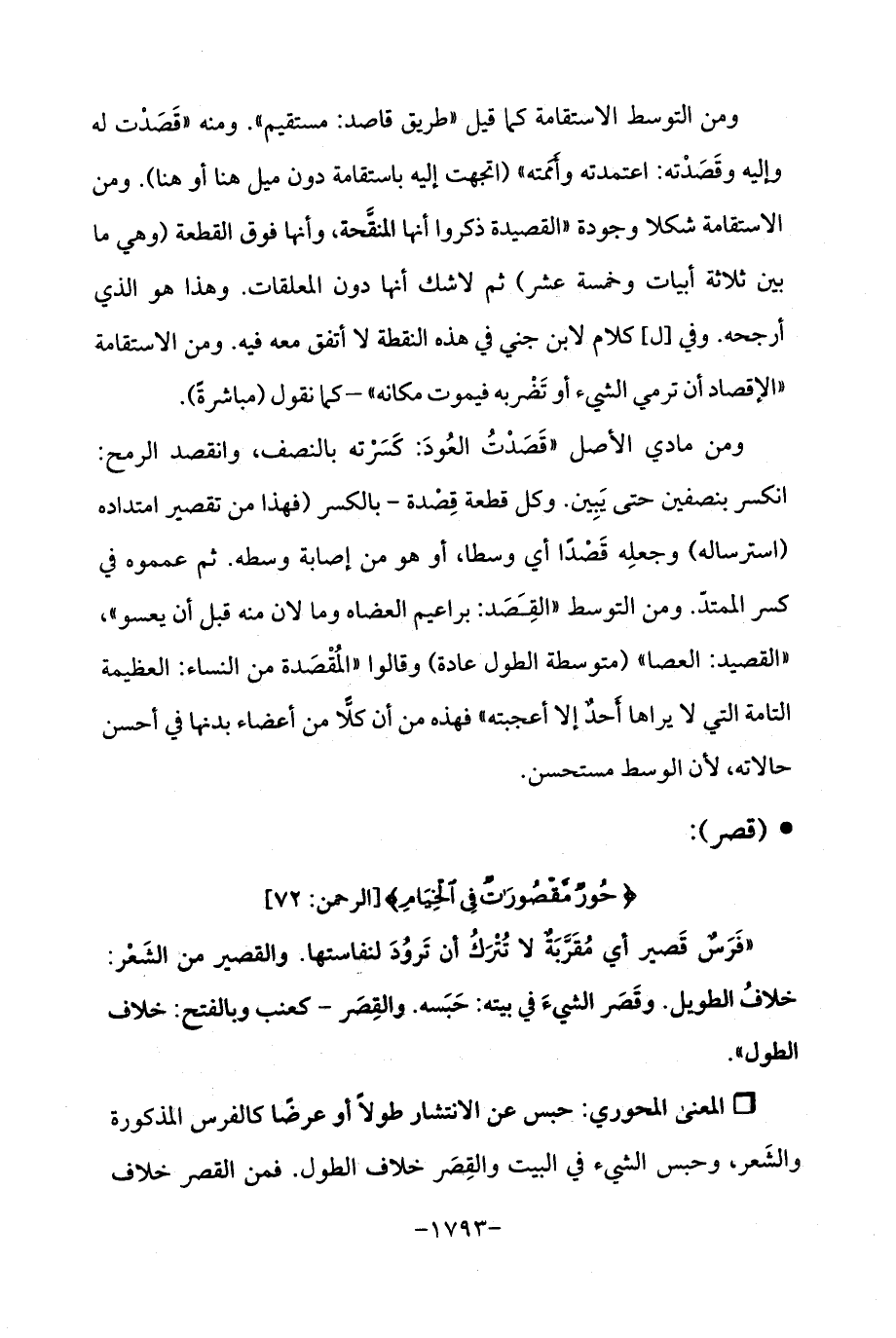 Qحبس عن الانتشار طولًا أو عرضًا كالفرس المذكورة والشَعر، وحبس الشيء في البيت والقِصَر خلاف الطول. فمن القصر خلاف