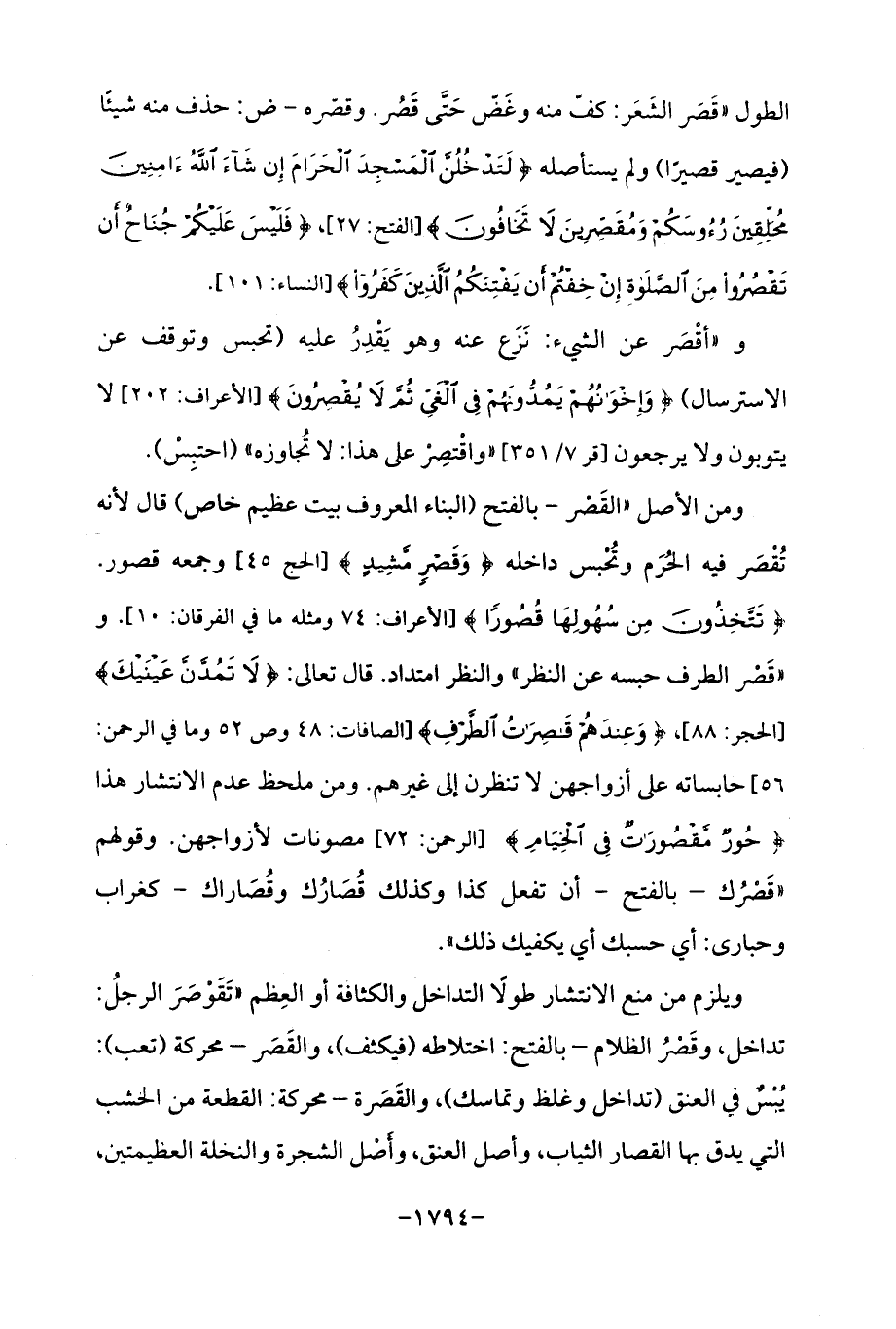 الطول "قَصَر الشَعَر: كفّ منه وغَضّ حَتَّى قَصُر. وقصّره - ض: حذف منه شيئًا (فيصير قصيرًا) ولم يستأصله {لَتَدْخُلُنَّ الْمَسْجِدَ الْحَرَامَ إِنْ شَاءَ اللَّهُ آمِنِينَ مُحَلِّقِينَ رُءُوسَكُمْ وَمُقَصِّرِينَ لَا تَخَافُونَ} [الفتح: 27] , {فَلَيْسَ عَلَيْكُمْ جُنَاحٌ أَنْ تَقْصُرُوا مِنَ الصَّلَاةِ إِنْ خِفْتُمْ أَنْ يَفْتِنَكُمُ الَّذِينَ كَفَرُوا} [النساء: 101].