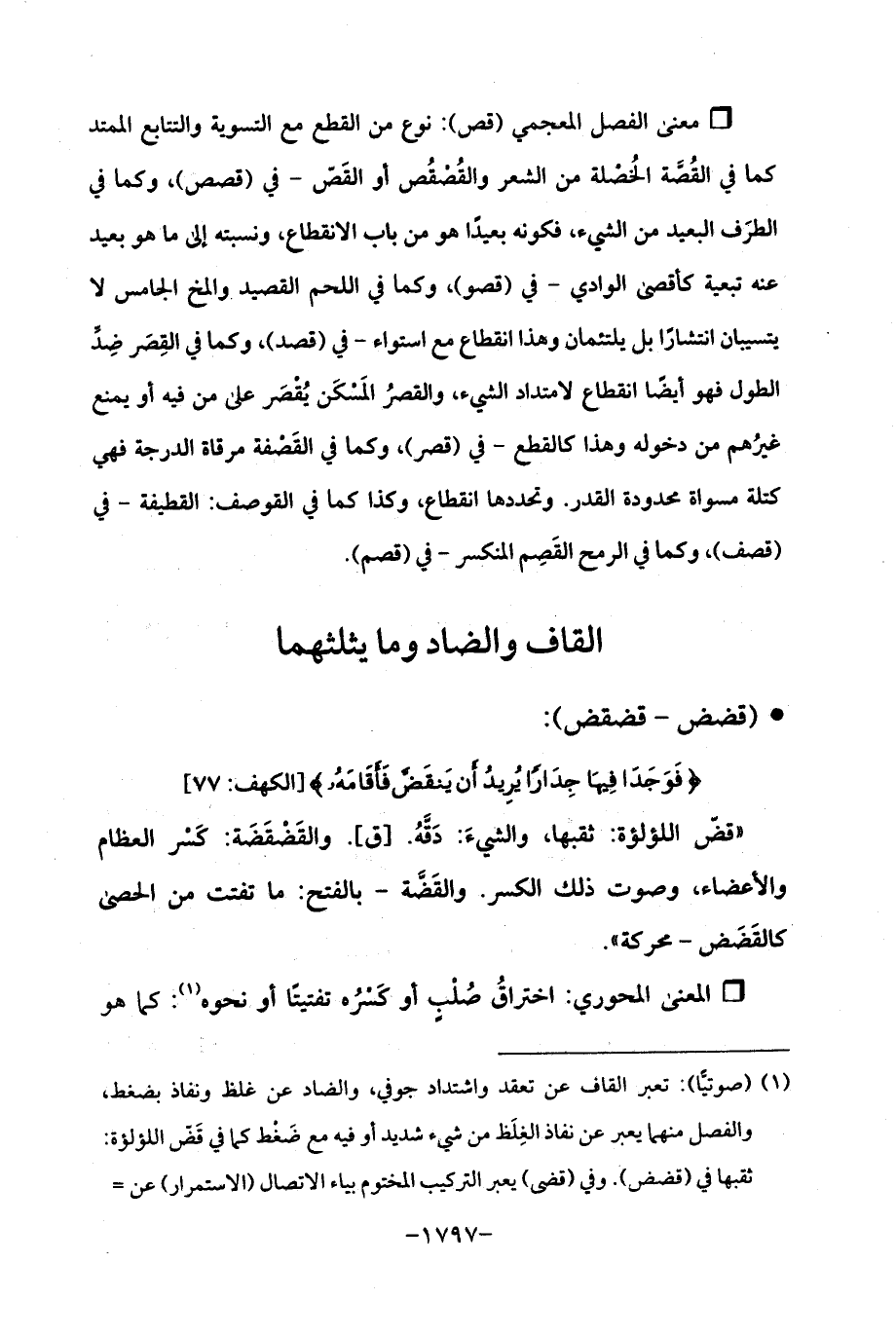 (¬1) (صوتيًّا): تعبر القاف عن تعقد واشتداد جوفي، والضاد عن غلظ ونفاذ بضغط، والفصل منهما يعبر عن نفاذ الغِلَظ من شيء شديد أو فيه مع ضَغْط كما في قَضّ اللؤلؤة: ثقبها في (قضض). وفي (قضى) يعبر التركيب المختوم بياء الاتصال (الاستمرار) عن =