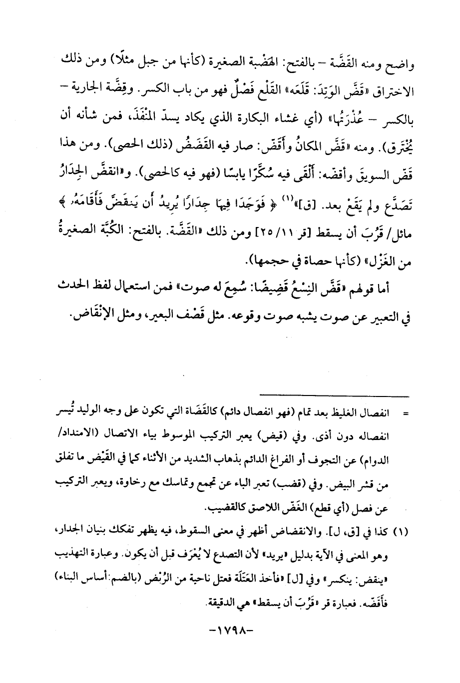 واضح ومنه القَضَّة - بالفتح: الهَضْبة الصغيرة (كأنها من جبل مثلًا) ومن ذلك الاختراق "قَضَّ الوَتِدَ: قَلَعَه "القَلْع فَصْلٌ فهو من باب الكسر. وقِضَّة الجارية - بالكسر - عُذْرَتُها " (أي غشاء البكارة الذي يكاد يسدّ المنْفَذَ، فمن شأنه أن يُخْتَرق). ومنه "قَضَّ المكانُ وأَقَضّ: صار فيه القَضَضُ (ذلك الحصى). ومن هذا قَضّ السويقَ وأقضّه: أَلْقَى فيه سُكَّرًا يابسًا (فهو فيه كالحصى). و "انقضَّ الجِدَارُ تَصَدَّع ولم يَقَعْ بعد. [ق] " (¬1) {فَوَجَدَا فِيهَا جِدَارًا يُرِيدُ أَنْ يَنْقَضَّ فَأَقَامَهُ} مائل/ قَرُبَ أن يسقط [قر 11/ 25] ومن ذلك "القَضَّة. بالفتح: الكُبَّة الصغيرةُ من الغَزْل " (كأنها حصاة في حجمها).