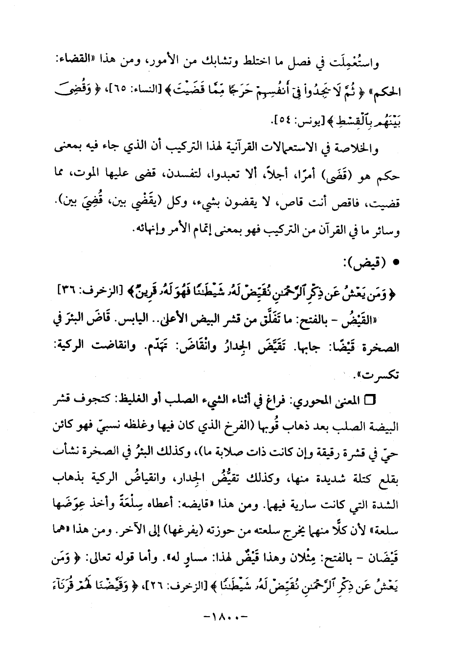 واستُعْمِلَت في فصل ما اختلط وتشابك من الأمور، ومن هذا "القضاء: الحكم " {ثُمَّ لَا يَجِدُوا فِي أَنْفُسِهِمْ حَرَجًا مِمَّا قَضَيْتَ} [النساء: 65]، {وَقُضِيَ بَيْنَهُمْ بِالْقِسْطِ} [يونس: 54].