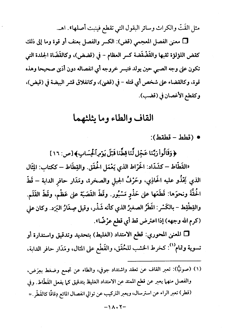 (¬1) (صوتيًّا): تعبر القاف عن تعقد واشتداد جوفي، والطاء عن تجمع وضغط بعِرَض، والفصل منهما يعبر عن قطع الممتد عن الامتداد الغليظ بتدقيق كما يفعل القَطّاط. وفي (قطر) تعبر الراء عن استرسال، ويعبر التركيب عن توالي انفصال المائع دِقاقًا كالقَطْر. =