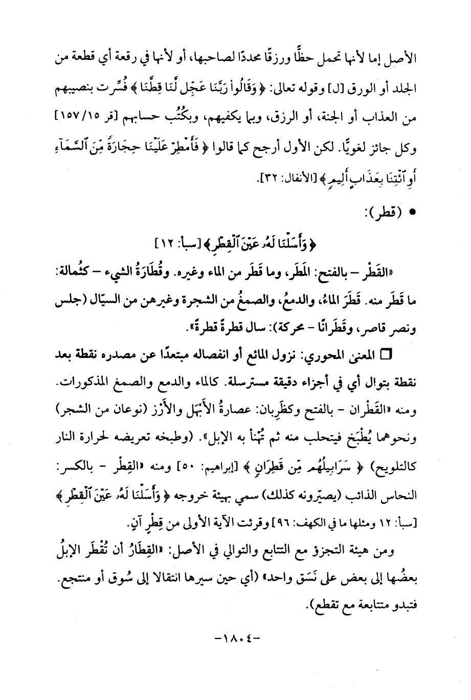 Qنزول المائع أو انفصاله مبتعدًا عن مصدره نقطة بعد نقطة بتوال أي في أجزاء دقيقة مسترسلة. كالماء والدمع والصمغ المذكورات. ومنه "القَطْران - بالفتح وكظَرِبان: عصارةُ الأَبْهَل والأَرْز (نوعان من الشجر) ونحوهما يُطْبَخ فيتحلب منه ثم تُهْنأ به الإبل ". (وطبخه تعريضه لحرارة النار كالتلويح) {سَرَابِيلُهُمْ مِنْ قَطِرَانٍ} [إبراهيم: 50] ومنه "القِطْر - بالكسر: النحاس الذائب (يصيّرونه كذلك) سمي بهيئة خروجه {وَأَسَلْنَا لَهُ عَيْنَ الْقِطْرِ} [سبأ: 12 ومثلها ما في الكهف: 96] وقرئت الآية الأولى من قِطْرٍ آنٍ.
