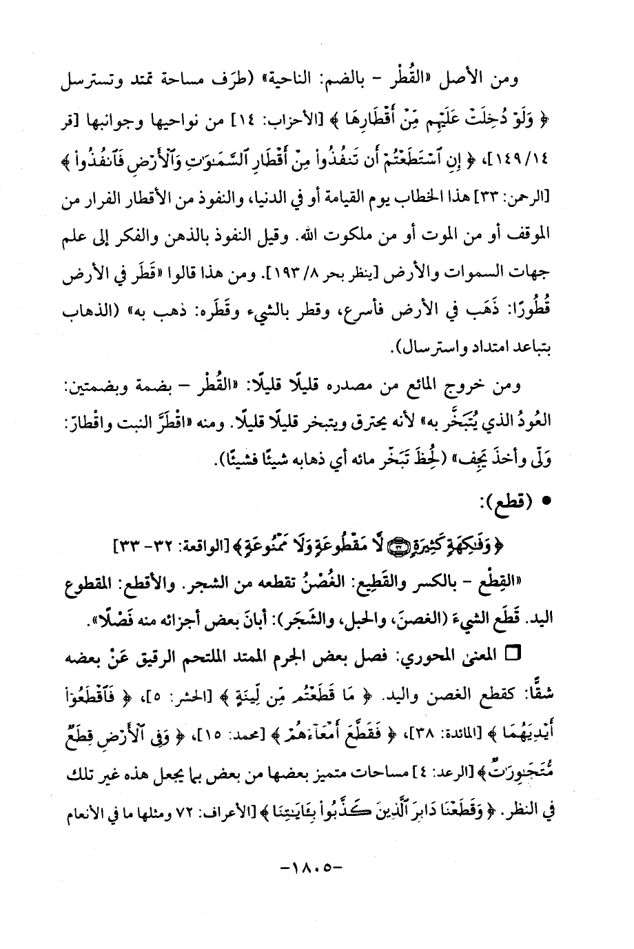 ومن الأصل "القُطْر - بالضم: الناحية " (طرَف مساحة تمتد وتسترسل {وَلَوْ دُخِلَتْ عَلَيْهِمْ مِنْ أَقْطَارِهَا} [الأحزاب: 14] من نواحيها وجوانبها [قر 14/ 149] , {إِنِ اسْتَطَعْتُمْ أَنْ تَنْفُذُوا مِنْ أَقْطَارِ السَّمَاوَاتِ وَالْأَرْضِ فَانْفُذُوا} [الرحمن: 33] هذا الخطاب يوم القيامة أو في الدنيا، والنفوذ من الأقطار الفرار من الموقف أو من الموت أو من ملكوت الله. وقيل النفوذ بالذهن والفكر إلى علم جهات السموات والأرض [ينظر بحر 8/ 193]. ومن هذا قالوا "قَطَر في الأرض قُطُورًا: ذَهَب في الأرض فأسرع، وقطر بالشيء وقَطَره: ذهب به " (الذهاب بتباعد امتداد واسترسال).