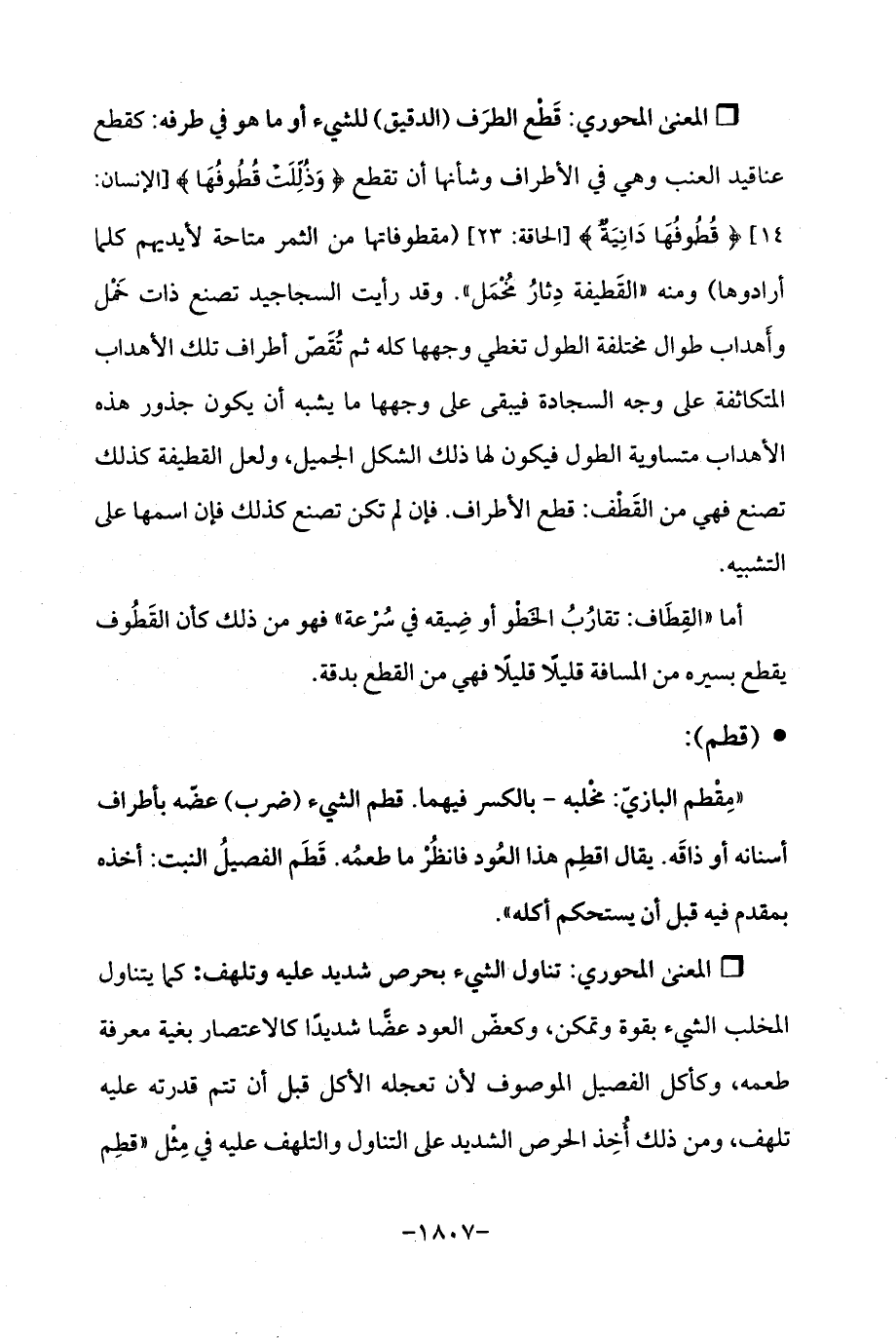 Qقَطْع الطرَف (الدقيق) للشيء أو ما هو في طرفه: كقطع عناقيد العنب وهي في الأطراف وشأنها أن تقطع {وَذُلِّلَتْ قُطُوفُهَا} [الإنسان: 14] {قُطُوفُهَا دَانِيَةٌ} [الحاقة: 23] (مقطوفاتها من الثمر متاحة لأيديهم كلما أرادوها) ومنه "القَطيفة دِثارُ مُخْمَل ". وقد رأيت السجاجيد تصنع ذات خَمْل وأَهداب طوال مختلفة الطول تغطي وجهها كله ثم تُقَصّ أطراف تلك الأهداب المتكاثفة على وجه السجادة فيبقى على وجهها ما يشبه أن يكون جذور هذه الأهداب متساوية الطول فيكون لها ذلك الشكل الجميل، ولعل القطيفة كذلك تصنع فهي من القَطْف: قطع الأطراف. فإن لم تكن تصنع كذلك فإن اسمها على التشبيه.