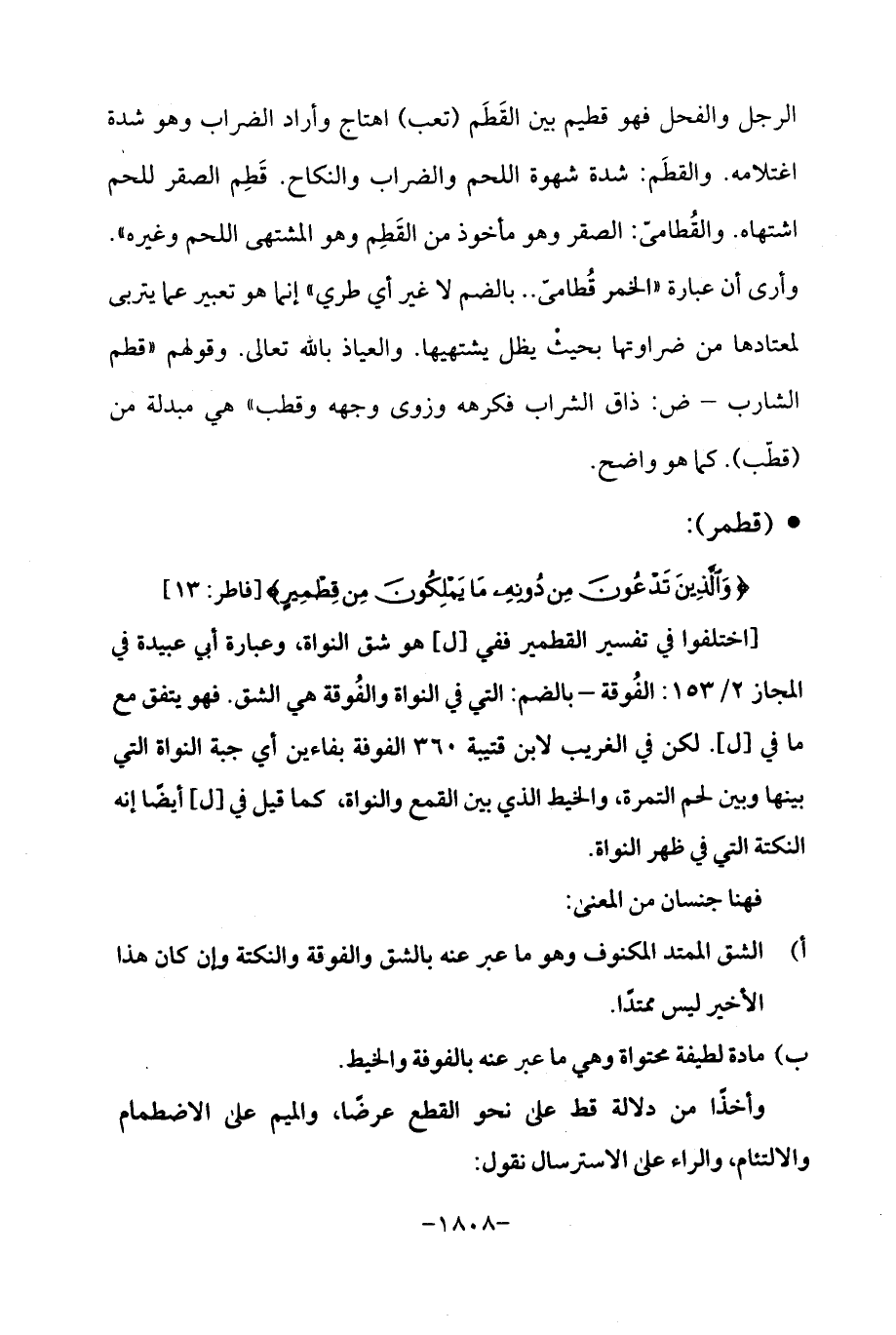 [اختلفوا في تفسير القطمير ففي [ل] هو شق النواة، وعبارة أبي عبيدة في المجاز 2/ 153: الفُوقة - بالضم: التي في النواة والفُوقة هي الشق. فهو يتفق مع ما في [ل]. لكن في الغريب لابن قتيبة 360 الفوفة بفاءين أي جبة النواة التي بينها وبين لحم التمرة، والخيط الذي بين القمع والنواة، كما قيل في [ل] أيضًا إنه النكتة التي في ظهر النواة.