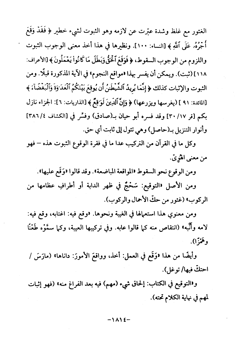الغئور مع غلظ وشدة عبّرت عن لازمه وهو الثبوت لشيء خطير {فَقَدْ وَقَعَ أَجْرُهُ عَلَى اللَّهِ} [النساء: 100]. ونظيرها في هذا أخذ معنى الوجوب الثبوت واللزوم من الوجوب السقوط، {فَوَقَعَ الْحَقُّ وَبَطَلَ مَا كَانُوا يَعْمَلُونَ} [الأعراف: 118] (ثبت). ويمكن أن يفسر بهذا "مواقع النجوم "في الآية المذكورة قبلًا. ومن الثبوت والإثبات كذلك {إِنَّمَا يُرِيدُ الشَّيْطَانُ أَنْ يُوقِعَ بَيْنَكُمُ الْعَدَاوَةَ وَالْبَغْضَاءَ} [المائدة: 91] (يغرسها ويزرعها) {وَإِنَّ الدِّينَ لَوَاقِعٌ} [الذاريات: 6]: الجزاء نازل بكم [قر 17/ 30] وقد فسره أبو حيان بـ (صادق) وفسِّر في [الكشاف 4/ 386] وأنوار التنزيل بـ (حاصل) وهي تئول إلى ثابت أي حق.