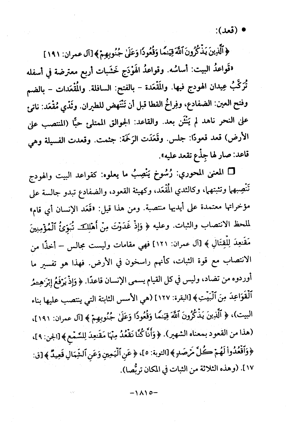 Qرُسُوخ يَنْصِبُ ما يعلوه: كقواعد البيت والهودج تَنْصِبهما وتثبتهما، وكالثدي المُقْعَد، وكهيئة القعود، والضفادع تبدو جالسة على مؤخراتها معتمدة على أيديها منتصبة. ومن هذا قيل: "قَعَد الإنسان أي قام "لملحظ الانتصاب والثبات. وعليه {وَإِذْ غَدَوْتَ مِنْ أَهْلِكَ تُبَوِّئُ الْمُؤْمِنِينَ مَقَاعِدَ لِلْقِتَالِ} [آل عمران: 121] فهي مقامات وليست مجالس - أخذًا من الانتصاب مع قوة الثبات، كأنهم راسخون في الأرض. فهذا هو تفسير ما أوردوه من تضاد، وليس في كل القيام يسمى الإنسان قاعدًا. {وَإِذْ يَرْفَعُ إِبْرَاهِيمُ الْقَوَاعِدَ مِنَ الْبَيْتِ} [البقرة: 127] (هي الأسس الثابتة التي ينتصب عليها بناء البيت)، {الَّذِينَ يَذْكُرُونَ اللَّهَ قِيَامًا وَقُعُودًا وَعَلَى جُنُوبِهِمْ} [آل عمران: 191]، (هذا من القعود بمعناه الشهير). {وَأَنَّا كُنَّا نَقْعُدُ مِنْهَا مَقَاعِدَ لِلسَّمْعِ} [الجن: 9]، {وَاقْعُدُوا لَهُمْ كُلَّ مَرْصَدٍ} [التوبة: 5]، {عَنِ الْيَمِينِ وَعَنِ الشِّمَالِ قَعِيدٌ} [ق: 17]. (وهذه الثلاثة من الثبات في المكان تربُّصا).