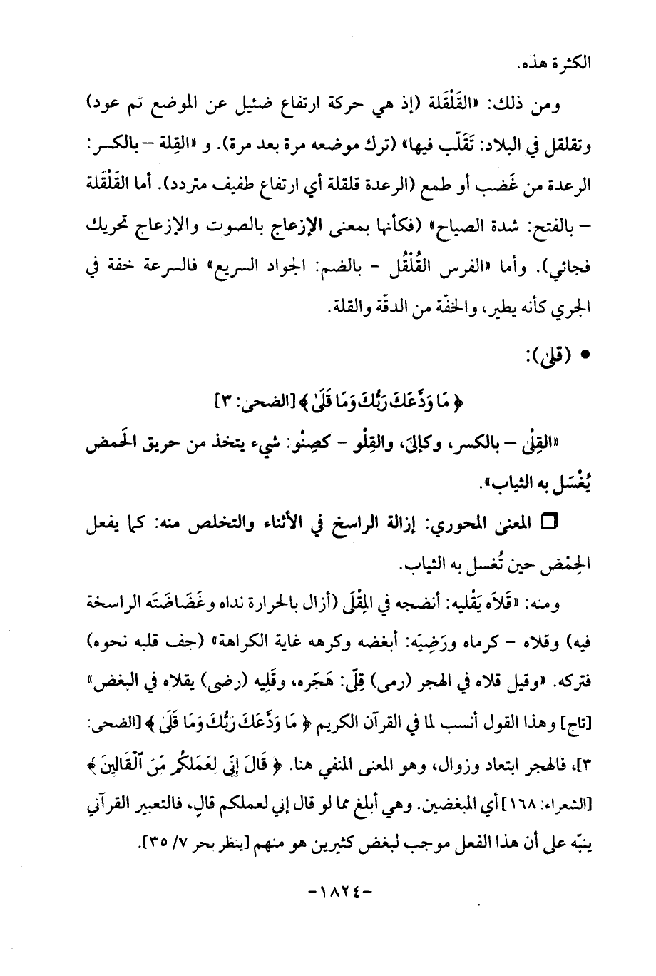 ومنه: "قَلَاه يَقْليه: أنضجه في المِقْلَى (أزال بالحرارة نداه وغَضَاضَتَه الراسخة فيه) وقلاه - كرماه ورَضِيَه: أبغضه وكرهه غاية الكراهة " (جف قلبه نحوه) فتركه. "وقيل قلاه في الهجر (رمى) قِلّى: هَجَره، وقَلِيه (رضى) يقلاه في البغض " [تاج] وهذا القول أنسب لما فى القرآن الكريم {مَا وَدَّعَكَ رَبُّكَ وَمَا قَلَى} [الضحى: 3] , فالهجر ابتعاد وزوال، وهو المعنى المنفي هنا. {قَالَ إِنِّي لِعَمَلِكُمْ مِنَ الْقَالِينَ} [الشعراء: 168] أي المبغضين. وهي أبلغ مما لو قال إنى لعملكم قالٍ, فالتعبير القرآني ينبّه على أن هذا الفعل موجب لبغض كثيرين هو منهم [ينظر بحر 7/ 35].
