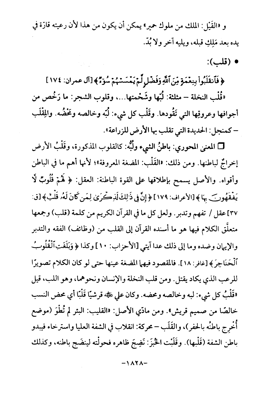 Qباطنُ الشيء ولُبُّه: كالقلوب المذكورة، وقَلْبُ الأرض إخراجٌ لباطنها. ومن ذلك: "القَلْب: المضغة المعروفة "؛ لأنها أهم ما في الباطن وأقواه. والأصل يسمح بإطلاقها على القوة الباطنة: العقل: {لَهُمْ قُلُوبٌ لَا يَفْقَهُونَ بِهَا} [الأعراف: 179] {إِنَّ فِي ذَلِكَ لَذِكْرَى لِمَنْ كَانَ لَهُ قَلْبٌ} [ق: 37] عقل/ تفهم وتدبر. ولعل كل ما في القرآن الكريم من كلمة (قلب) وجمعها متعلَّق الكلام فيها هو ما أسنده القرآن إلى القلب من (وظائف) الفقه والتدبر والإيمان وضده وما إلى ذلك عدا آيتي [الأحزاب: 10] وكذا {وَبَلَغَتِ الْقُلُوبُ الْحَنَاجِرَ} [غافر: 18]. فالمقصود فيهما المضغة عينها حتى لو كان الكلام تصويرًا للرعب الذي يكاد يقتل. ومن قلب النخلة والإنسان ونحوهما، وهو اللب، قيل "قَلْبُ كل شيء: لبه وخالصه ومحضه. وكان علي - رضي الله عنه - قرشيًا قَلْبًا أي محض النسب خالصًا من صميم قريش ". ومن مادّي الأصل: "القليب: البئر لم تُطْوَ (موضع أُخْرِج باطنُه بالحفر)، والقَلَب - محركة: انقلاب في الشفة العليا واسترخاء فيبدو باطن الشفة (قَلْبها). وقَلَبْت الخُبزَ: نَضِجَ ظاهره فحوّلْته لينضَج باطنه، وكذلك