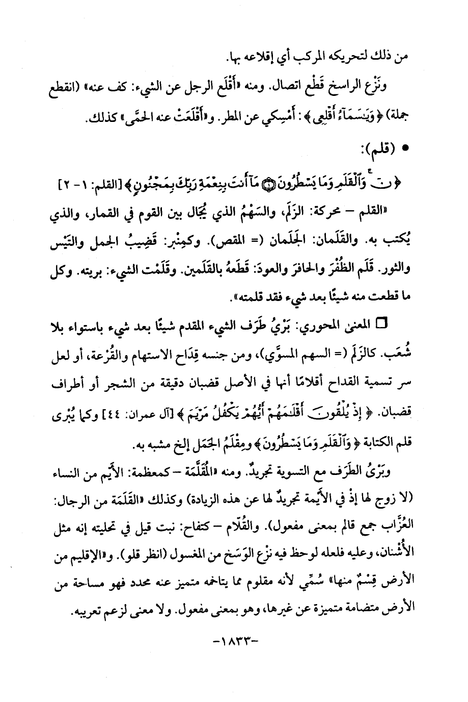 Qبَرْيُ طَرَف الشيء المقدم شيئًا بعد شيء باستواء بلا شُعَب. كالزَلَم (= السهم المسوَّي)، ومن جنسه قِدَاح الاستهام والقُرْعة، أو لعل سر تسمية القداح أقلامًا أنها في الأصل قضبان دقيقة من الشجر أو أطراف قضبان. {إِذْ يُلْقُونَ أَقْلَامَهُمْ أَيُّهُمْ يَكْفُلُ مَرْيَمَ} [آل عمران: 44] وكما يُبْرى قلم الكتابة {وَالْقَلَمِ وَمَا يَسْطُرُونَ} ومِقْلَمُ الجَمَل إلخ مشبه به.