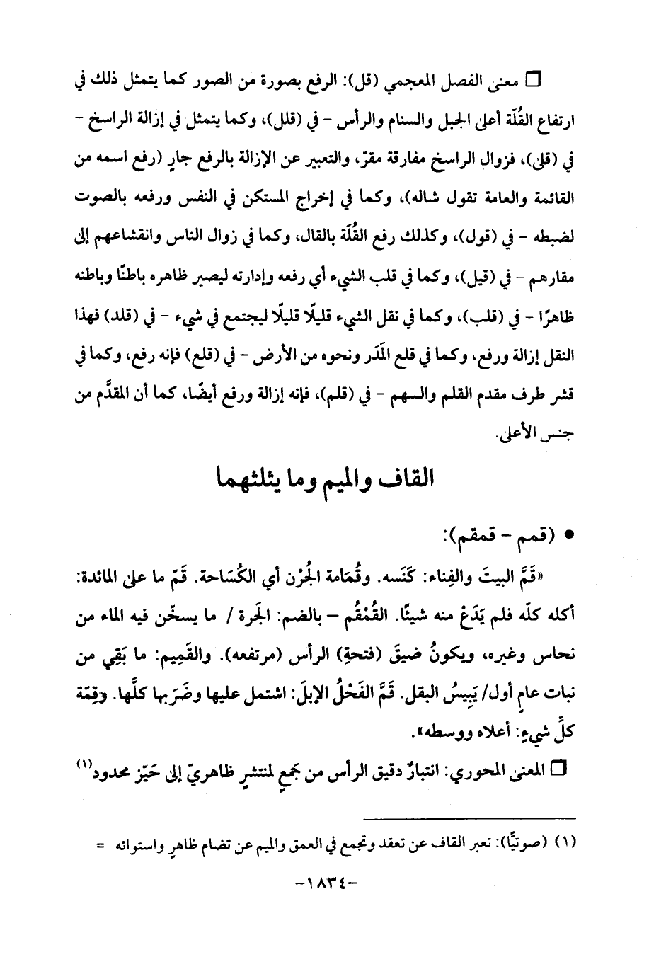 ° معنى الفصل المعجمي (قل): الرفع بصورة من الصور كما يتمثل ذلك في ارتفاع القُلّة أعلى الجبل والسنام والرأس - في (قلل)، وكما يتمثل في إزالة الراسخ - في (قلى)، فزوال الراسخ مفارقة مقرّ، والتعبير عن الإزالة بالرفع جارٍ (رفع اسمه من القائمة والعامة تقول شاله)، وكما في إخراج المستكن في النفس ورفعه بالصوت لضبطه - في (قول)، وكذلك رفع القُلَة بالقال، وكما في زوال الناس وانقشاعهم إلى مقارهم - في (قيل)، وكما في قلب الشيء أي رفعه وإدارته ليصير ظاهره باطنًا وباطنه ظاهرًا - في (قلب)، وكما في نقل الشيء قليلًا قليلًا ليجتمع في شيء - في (قلد) فهذا النقل إزالة ورفع، وكما في قلع المَدَر ونحوه من الأرض - في (قلع) فإنه رفع، وكما في قشر طرف مقدم القلم والسهم - في (قلم)، فإنه إزالة ورفع أيضًا، كما أن المقدَّم من جنس الأعلى.
