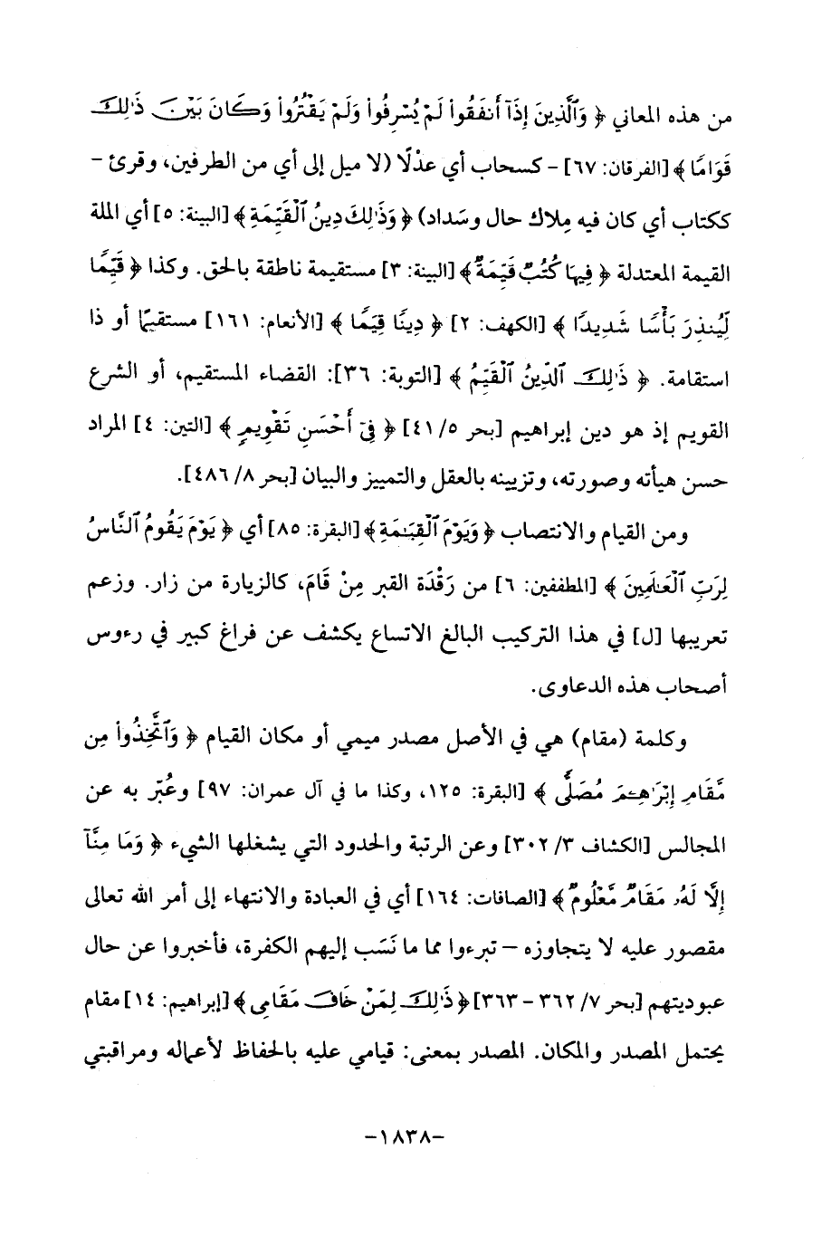 من هذه المعاني {وَالَّذِينَ إِذَا أَنْفَقُوا لَمْ يُسْرِفُوا وَلَمْ يَقْتُرُوا وَكَانَ بَيْنَ ذَلِكَ قَوَامًا} [الفرقان: 67]- كسحاب أي عدْلًا (لا ميل إلى أي من الطرفين، وقرئ - ككتاب أي كان فيه مِلاك حال وسَداد) {وَذَلِكَ دِينُ الْقَيِّمَةِ} [البينة: 5] أي الملة القيمة المعتدلة {فِيهَا كُتُبٌ قَيِّمَةٌ} [البينة: 3] مستقيمة ناطقة بالحق. وكذا {قَيِّمًا لِيُنْذِرَ بَأْسًا شَدِيدًا} [الكهف: 2] {دِينًا قِيَمًا} [الأنعام: 161] مستقيمًا أو ذا استقامة. {ذَلِكَ الدِّينُ الْقَيِّمُ} [التوبة: 36]: القضاء المستقيم، أو الشرع القويم إذ هو دين إبراهيم [بحر 5/ 41] {فِي أَحْسَنِ تَقْوِيمٍ} [التين: 4] المراد حسن هيأته وصورته، وتزيينه بالعقل والتمييز والبيان [بحر 8/ 486].