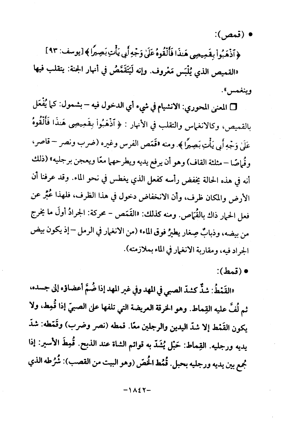 Qالانشيام في شيء أي الدخول فيه - بشمول: كما يُفْعَل بالقميص، وكالانغماس والتقلب في الأنهار: {اذْهَبُوا بِقَمِيصِي هَذَا فَأَلْقُوهُ عَلَى وَجْهِ أَبِي يَأْتِ بَصِيرًا}. ومنه "قَمَص الفرس وغيره (ضرب ونصر - قاصر، وقُماصًا - مثلثة القاف) وهو أن يرفع يديه ويطرحهما معًا ويعجن برجليه " (ذلك أنه في هذه الحالة يخفض رأسه كفعل الذي يغطس في نحو الماء. وقد عرفنا أن الأرض والمكان ظرف، وأن الانخفاض دخول في هذا الظرف، فلهذا عُبِّر عن فعل الحمار ذاك بالقُمَاص. ومنه كذلك: "القَمَص - محركة: الجرادُ أولَ ما يخرج من بيضه، وذبابٌ صِغار يطيرُ فوق الماء " (من الانغمار في الرمل - إذ يكون بيض الجراد فيه، ومقاربة الانغمار في الماء بملازمته).