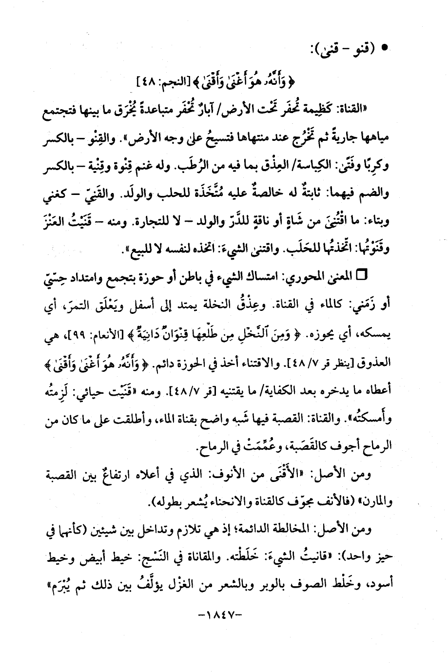 Qامتساك الشيء في باطن أو حوزة بتجمع وامتداد حِسّيّ أو زَمَني: كالماء في القناة. وعِذْقُ النخلة يمتد إلى أسفل ويَعْلَق التمرَ، أي يمسكه، أي يحوزه. {وَمِنَ النَّخْلِ مِنْ طَلْعِهَا قِنْوَانٌ دَانِيَةٌ} [الأنعام: 99]، هي العذوق [ينظر قر 7/ 48]. والاقتناء أخذ في الحوزة دائم. {وَأَنَّهُ هُوَ أَغْنَى وَأَقْنَى} أعطاه ما يدخره بعد الكفاية/ ما يقتنيه [قر 7/ 48]. ومنه "قَنَيْت حيائي: لَزِمتُه وأَمسكتُه ". والقناة: القصبة فيها شَبه واضح بقناة الماء، وأطلقت على ما كان من الرماح أجوف كالقَصَبة، وعُمِّمَتْ في الرماح.