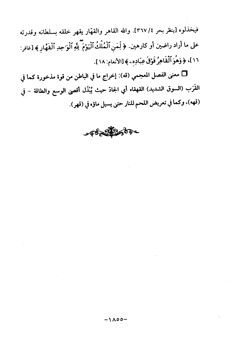 ° معنى الفصل المعجمي (قه): إخراج ما في الباطن من قوة مذخورة كما في القَرَب (السوق الشديد) القهقاه أي الجادّ حيث يُبْذَل أقصى الوسع والطاقة - في (قهه)، وكما في تعريض اللحم للنار حتى يسيل ماؤه في (قهر).