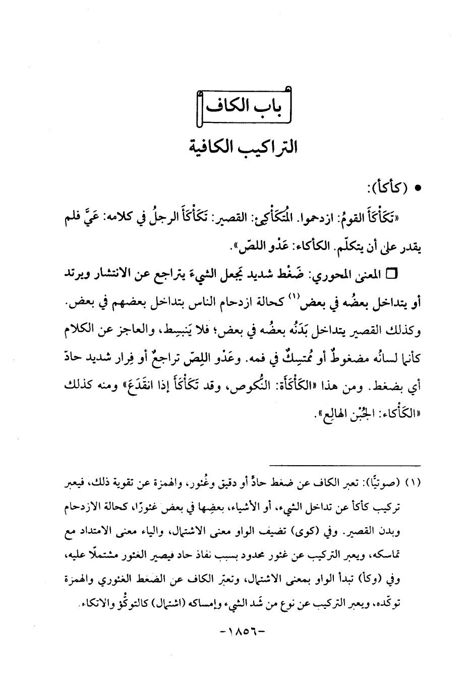 (¬1) (صوتيًّا): تعبر الكاف عن ضغط حادٍّ أو دقيق وغُئور، والهمزة عن تقوية ذلك، فيعبر تركيب كأكأ عن تداخل الشيء، أو الأشياء، بعضِها في بعض غئورًا، كحالة الازدحام وبدن القصير. وفي (كوى) تضيف الواو معنى الاشتمال، الياء معنى الامتداد مع تماسكه، ويعبر التركيب عن غئور محدود بسبب نفاذ حاد فيصير الغئور مشتملًا عليه، وفي (وكأ) تبدأ الواو بمعنى الاشتمال، وتعبّر الكاف عن الضغط الغئوري والهمزة توكّده، ويعبر التركيب عن نوع من شد الشيء وإمساكه (اشتمال) كالتوكُّؤ والاتكاء.