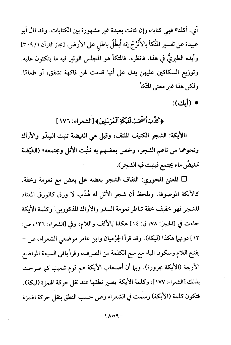 Qالتفاف الشجر بعضه على بعض مع نعومة وخفة. كالأيكة الموصوفة. ويلحظ أن شجر الأثل له هُدْب لا ورق كالورق المعتاد للشجر فهو خفيف خفة تناظر نعومة السدر والأراك المذكورين. وكلمة الأيكة جاءت في [الحجر: 78، ق: 14] هكذا بالألف واللام، وفي [الشعراء: 136، ص: 13] دونهما هكذا (ليكة). وقد قرأ الحِرْميان وابن عامر موضعي الشعراء، ص - بفتح اللام وسكون الياء مع منع الكلمة من الصرف، وقرأ باقي السبعة المواضع الأربعة (الأيكة مجرورة). وبما أن أصحاب الأيكة هم قوم شعيب كما صرحت بذلك [الشعراء: 177]، وكلمة الأيكة يصير نطقها عند نقل حركة الهمزة (ليكة). فتكون كلمة (الأيكة) رسمت في الشعراء وص حسب النطق بنقل حركة الهمزة