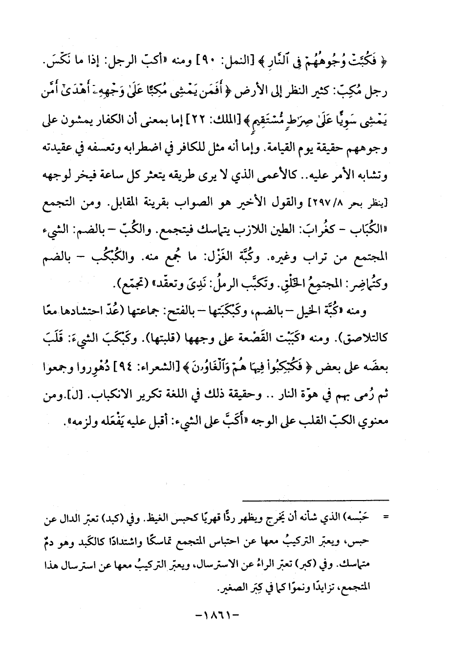 {فَكُبَّتْ وُجُوهُهُمْ فِي النَّارِ} [النمل: 90] ومنه "أكبّ الرجل: إذا ما نَكّسَ. رجل مُكِبَ: كثير النظر إلى الأرض {أَفَمَنْ يَمْشِي مُكِبًّا عَلَى وَجْهِهِ أَهْدَى أَمَّنْ يَمْشِي سَوِيًّا عَلَى صِرَاطٍ مُسْتَقِيمٍ} [الملك: 22] إما بمعنى أن الكفار يمشون على وجوههم حقيقة يوم القيامة. وإما أنه مثل للكافر في اضطرابه وتعسفه في عقيدته وتشابه الأمر عليه .. كالأعمى الذي لا يرى طريقه يتعثر كل ساعة فيخر لوجهه [ينظر بحر 8/ 297] والقول الأخير هو الصواب بقرينة المقابل. ومن التجمع "الكُبَاب - كغُرابَ: الطين اللازب يتماسك فيتجمع. والكُبّ - بالضم: الشيء المجتمع من تراب وغيره. وكُبَّة الغَزْل: ما جُمع منه. والكُبْكُب - بالضم وكتُماضِر: المجتمِعُ الخَلْقِ. وتَكبَّب الرملُ: نَدِىَ وتعقّد " (تجمّع).