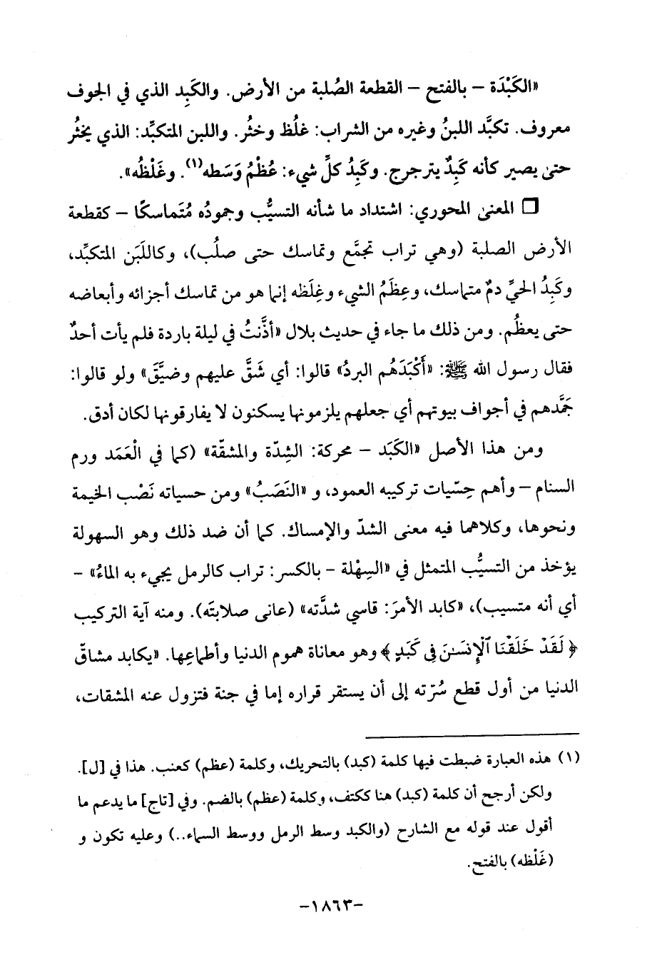 "الكَبْدَة - بالفتح - القطعة الصُلبة من الأرض. والكَبِد الذي في الجوف معروف. تكبَّد اللبنُ وغيره من الشراب: غلُظ وخثُر. واللبن المتكبِّد: الذي يخثُر حتى يصير كأنه كَبِدٌ يترجرج. وكَبِدُ كلِّ شيء: عُظْمُ وَسَطه (¬1). وغَلْظُه ".