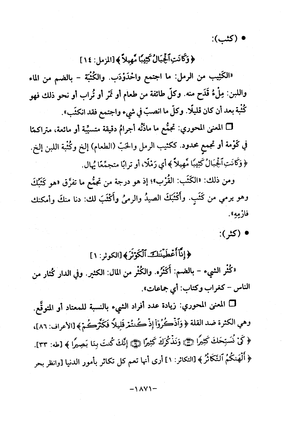 Qزيادة عدد أفراد الشيء بالنسبة للمعتاد أو المتوقَّع. وهي الكثرة ضد القلة {وَاذْكُرُوا إِذْ كُنْتُمْ قَلِيلًا فَكَثَّرَكُمْ} [الأعراف: 86]، {كَيْ نُسَبِّحَكَ كَثِيرًا (33) وَنَذْكُرَكَ كَثِيرًا (34) إِنَّكَ كُنْتَ بِنَا بَصِيرًا} [طه: 33 - 35]. {أَلْهَاكُمُ التَّكَاثُرُ} [التكاثر: 1] أرى أنها تعم كل تكاثر بأمور الدنيا [وانظر بحر