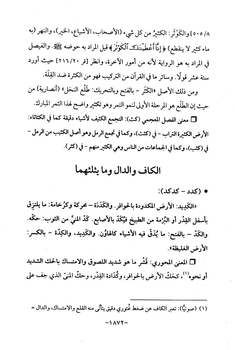 8/ 505] والكَوْثَر: الكثيرُ من كل شيء (الأصحاب، الأشياع، الخير)، والنهر (به ماء كثير لا ينقطع) {إِنَّا أَعْطَيْنَاكَ الْكَوْثَرَ} قيل المراد به حوضه - صلى الله عليه وسلم -. والفيصل في المراد به هو الرواية لأنه من أمور الآخرة، وانظر [قر 20/ 216] حيث أورد ستة عشر قولًا. وسائر ما في القرآن من التركيب فهو من الكثرة ضد القِلّة.