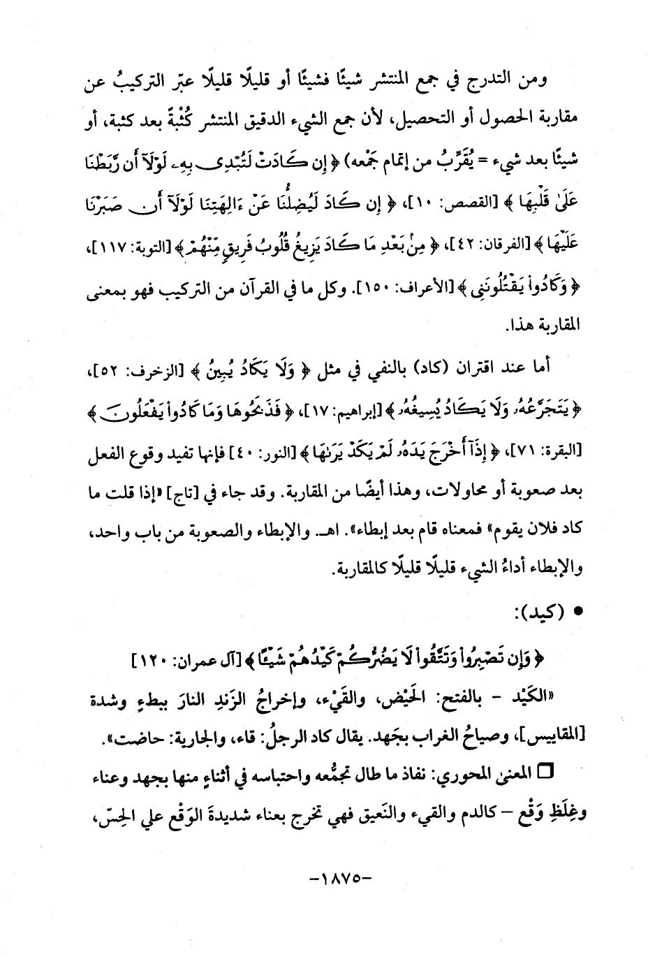 ومن التدرج في جمع المنتشر شيئًا فشيئًا أو قليلًا قليلًا عبّر التركيبُ عن مقاربة الحصول أو التحصيل، لأن جمع الشيء الدقيق المنتشر كُثْبةً بعد كثبة، أو شيئًا بعد شيء= يُقَرِّبُ من إتمام جَمْعه) {إِنْ كَادَتْ لَتُبْدِي بِهِ لَوْلَا أَنْ رَبَطْنَا عَلَى قَلْبِهَا} [القصص: 10]، {إِنْ كَادَ لَيُضِلُّنَا عَنْ آلِهَتِنَا لَوْلَا أَنْ صَبَرْنَا عَلَيْهَا} [الفرقان: 42]، {مِنْ بَعْدِ مَا كَادَ يَزِيغُ قُلُوبُ فَرِيقٍ مِنْهُمْ} [التوبة: 117]، {وَكَادُوا يَقْتُلُونَنِي} [الأعراف: 150]. وكل ما في القرآن من التركيب فهو بمعنى المقاربة هذا.
