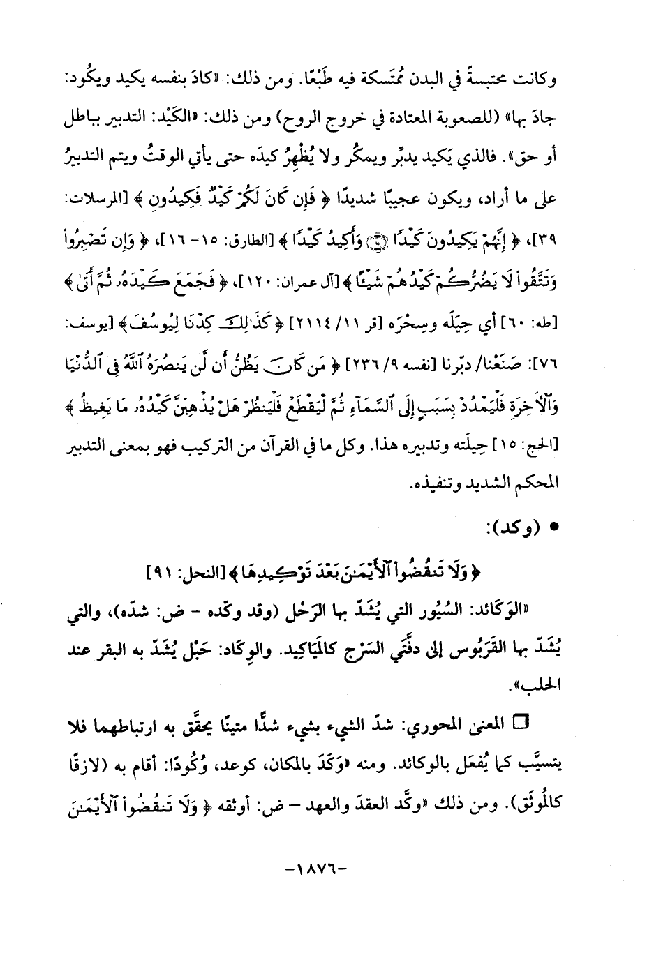وكانت محتبسةً في البدن مُمتَسكة فيه طَبْعًا. ومن ذلك: "كادَ بنفسه يكيد ويكُود: جادَ بها " (للصعوبة المعتادة في خروج الروح) ومن ذلك: "الكَيْد: التدبير بباطل أو حق ". فالذي يَكيد يدبِّر ويمكُر ولا يُظْهِرُ كيدَه حتى يأتي الوقتُ ويتم التدبيرُ على ما أراد، ويكون عجيبًا شديدًا {فَإِنْ كَانَ لَكُمْ كَيْدٌ فَكِيدُونِ} [المرسلات: 39]، {إِنَّهُمْ يَكِيدُونَ كَيْدًا (15) وَأَكِيدُ كَيْدًا} [الطارق: 15، 16]، {وَإِنْ تَصْبِرُوا وَتَتَّقُوا لَا يَضُرُّكُمْ كَيْدُهُمْ شَيْئًا} [آل عمران: 120]، {فَجَمَعَ كَيْدَهُ ثُمَّ أَتَى} [طه: 60] أي حِيَلَه وسِحْرَه [قر 11/ 2114] {كَذَلِكَ كِدْنَا لِيُوسُفَ} [يوسف: 76]: صَنَعْنا/ دبّرنا [نفسه 9/ 236] {مَنْ كَانَ يَظُنُّ أَنْ لَنْ يَنْصُرَهُ اللَّهُ فِي الدُّنْيَا وَالْآخِرَةِ فَلْيَمْدُدْ بِسَبَبٍ إِلَى السَّمَاءِ ثُمَّ لْيَقْطَعْ فَلْيَنْظُرْ هَلْ يُذْهِبَنَّ كَيْدُهُ مَا يَغِيظُ} [الحج: 15] حِيلَته وتدبيره هذا. وكل ما في القرآن من التركيب فهو بمعنى التدبير المحكم الشديد وتنفيذه.