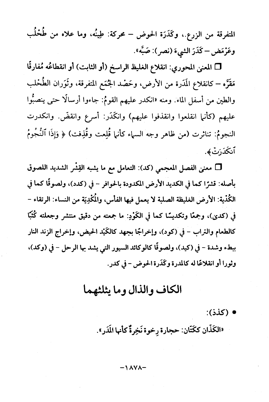 Qانقلاع الغليظ الراسخ (أو الثابت) أو انقطاعُه مُفارقًا مَقَرَّه - كانقلاع المَدَرة من الأرض، وحَصْد الجُمَع المتفرقة، وثَوَران الطُحْلب والطين من أسفل الماء. ومنه "انكدر عليهم القومُ: جاءوا أرسالًا حتى ينصبُّوا عليهم (كأنما انقلعوا وانقذفوا عليهم) وانكَدَر: أسرع وانقضّ. وانكدرت النجومُ: تناثرت (من ظاهر وجه السماء كأنما قُلِعت وقُذِفت) {وَإِذَا النُّجُومُ انْكَدَرَتْ}.