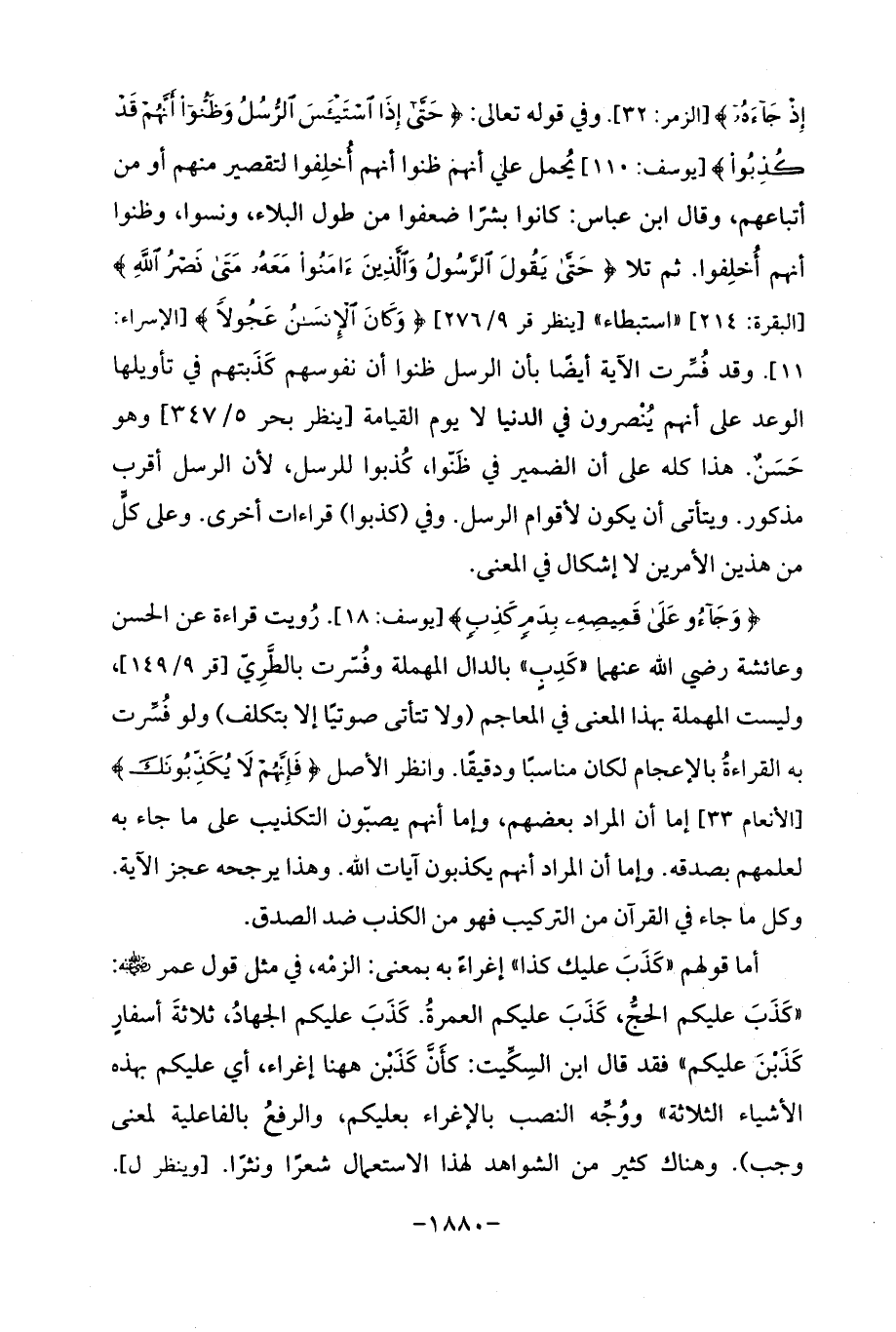 إِذْ جَاءَهُ} [الزمر: 32]. وفي قوله تعالى: {حَتَّى إِذَا اسْتَيْأَسَ الرُّسُلُ وَظَنُّوا أَنَّهُمْ قَدْ كُذِبُوا} [يوسف: 110] يُحمل في أنهم ظنوا أنهم أُخلِفوا لتقصير منهم أو من أتباعهم، وقال ابن عباس: كانوا بشرًا ضعفوا من طول البلاء، ونسوا، وظنوا أنهم أُخلِفوا. ثم تلا {حَتَّى يَقُولَ الرَّسُولُ وَالَّذِينَ آمَنُوا مَعَهُ مَتَى نَصْرُ اللَّهِ} [البقرة: 214] "استبطاء " [ينظر قر 9/ 276] {وَكَانَ الْإِنْسَانُ عَجُولًا} [الإسراء: 11]. وقد فُسِّرت الآية أيضًا بأن الرسل ظنوا أن نفوسهم كَذَبتهم في تأويلها الوعد على أنهم يُنْصرون في الدنيا لا يوم القيامة [ينظر بحر 5/ 347] وهو حَسَنٌ. هذا كله على أن الضمير في ظَنّوا، كُذبوا للرسل، لأن الرسل أقرب مذكور. ويتأتى أن يكون لأقوام الرسل. وفي (كذبوا) قراءات أخرى. وعلى كلًّ من هذين الأمرين لا إشكال في المعنى.