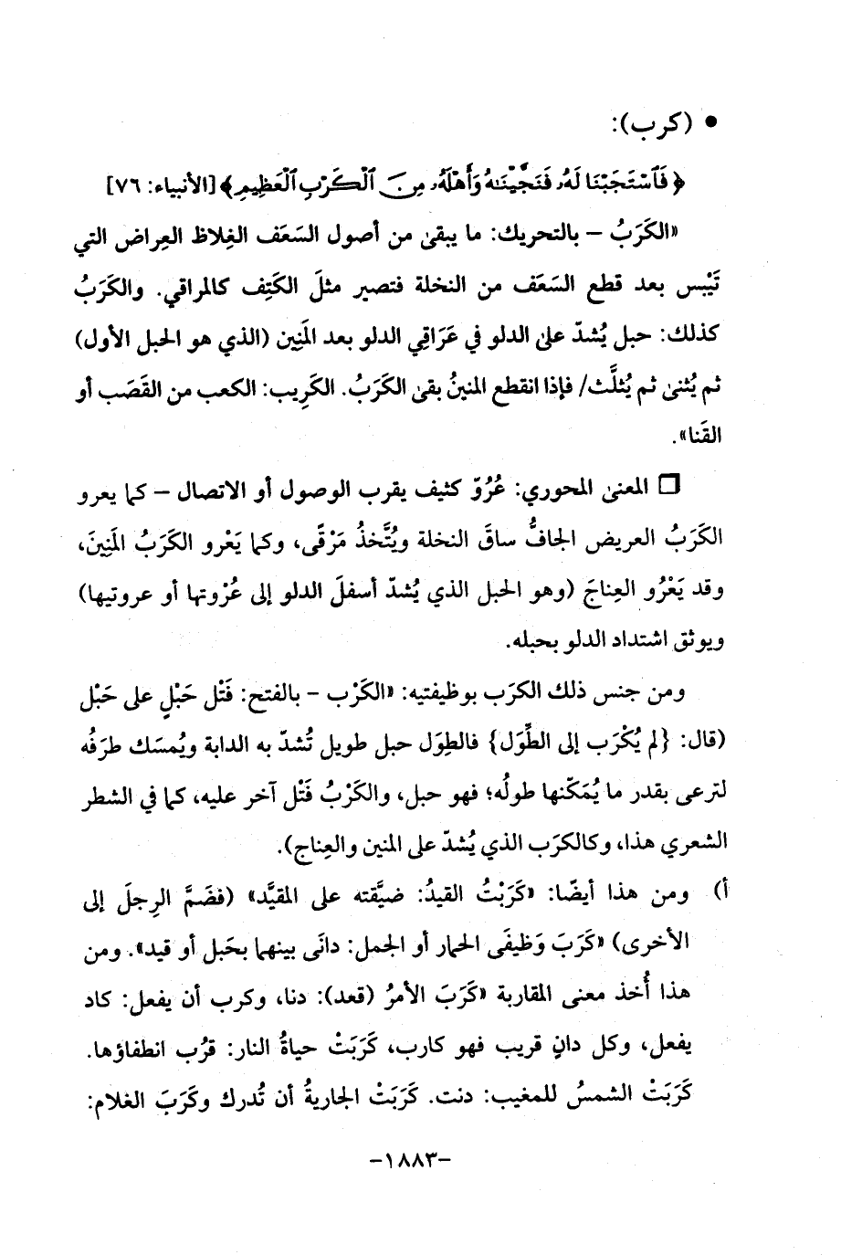 "الكَرَبُ - بالتحريك: ما يبقى من أصول السَعَف الغِلاظ العِراض التي تَيْبس بعد قطع السَعَف من النخلة فتصير مثلَ الكَتِف كالمراقي. والكَرَبُ كذلك: حبل يُشدّ على الدلو في عَرَاقِي الدلو بعد المَنِين (الذي هو الحبل الأول) ثم يُثنى ثم يُثلَّث/ فإذا انقطع المنينُ بقى الكَرَبُ. الكَرِيب: الكعب من القَصَب أو القَنا ".