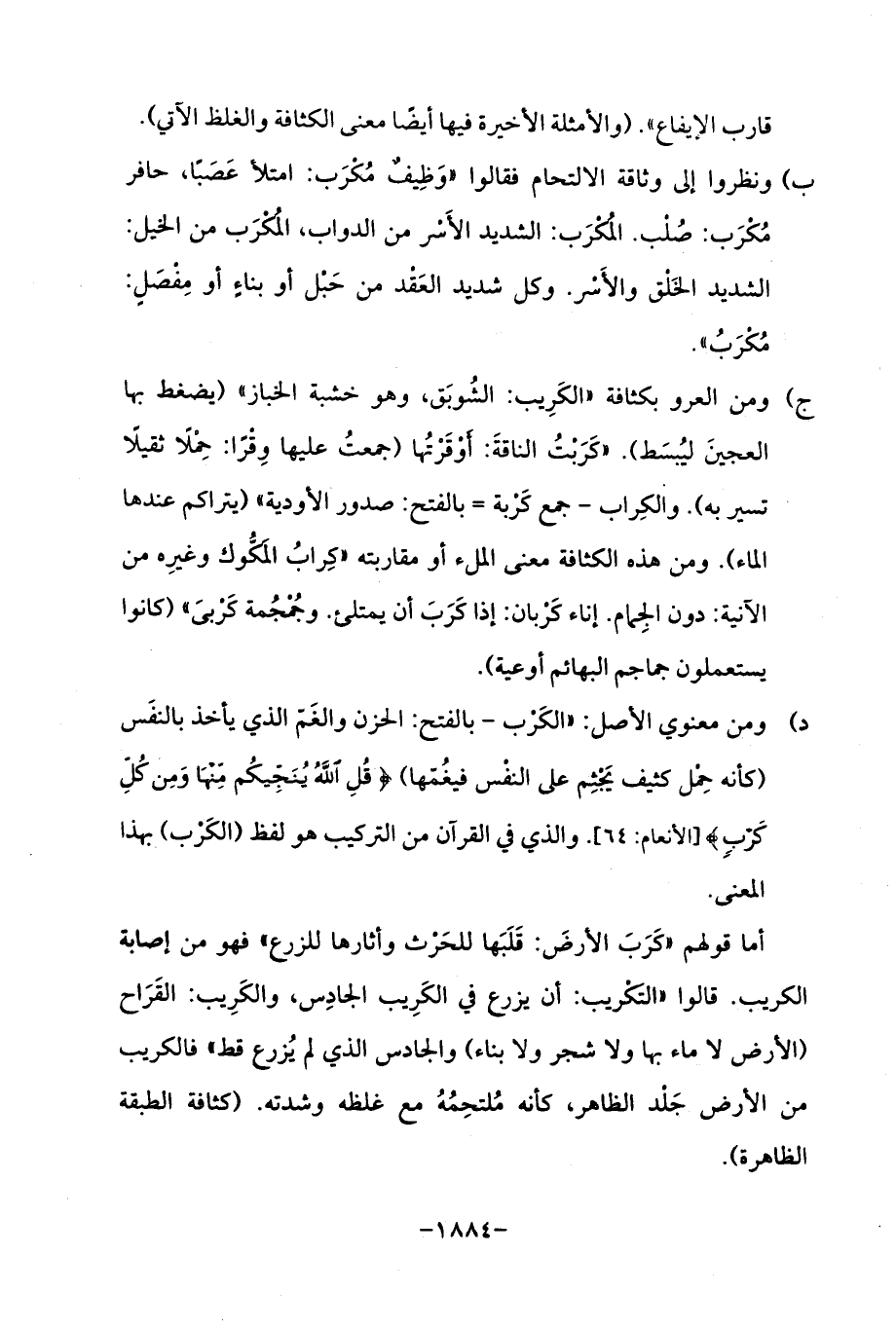 د) ومن معنوي الأصل: "الكَرْب - بالفتح: الحزن والغَمّ الذي يأخذ بالنفَس (كأنه حِمْل كثيف يَجْثِم على النفْس فيغُمّها) {قُلِ اللَّهُ يُنَجِّيكُمْ مِنْهَا وَمِنْ كُلِّ كَرْبٍ} [الأنعام: 64]. والذي في القرآن من التركيب هو لفظ (الكَرْب) بهذا المعنى.