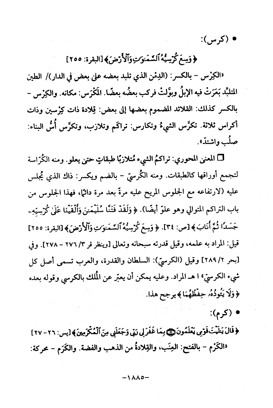 Qتراكمُ الشيء مُتلازبًا طبقاتٍ حتى يعلو. ومنه الكُرّاسة لتجمع أوراقها كالطبقات. ومنه الكُرسيّ - بالضم ويكسر: ذاك الذي يُجلس عليه (لارتفاعه مع الجلوس المريح عليه مرةً بعد مرة دائمًا، فهذا الجلوس من باب التراكم المتوالي وهو علوّ أيضًا). {وَلَقَدْ فَتَنَّا سُلَيْمَانَ وَأَلْقَيْنَا عَلَى كُرْسِيِّهِ جَسَدًا ثُمَّ أَنَابَ} [ص: 34]. {وَسِعَ كُرْسِيُّهُ السَّمَاوَاتِ وَالْأَرْضَ} [البقرة: 255] قيل: المراد به علمه، وقيل قدرته سبحانه وتعالى [وينظر قر 3/ 276 - 278]. وفي [بحر 2/ 289] وقيل (الكرسيّ): السلطان والقدرة، والعرب تسمى أصل كل شيء الكرسيّ "اهـ المراد. وعليه يمكن أن يعبّر عن المُلك بالكرسي وقوله بعده {وَلَا يَئُودُهُ حِفْظُهُمَا} يرجح هذا.