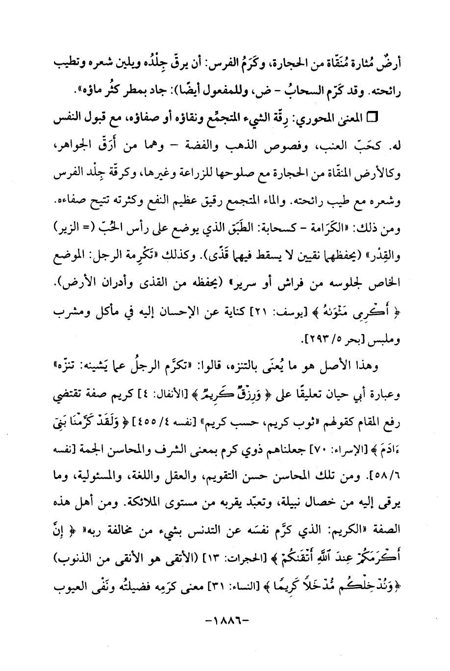 وهذا الأصل هو ما يُعنَى بالتنزه، قالوا: "تكرَّم الرجلُ عما يَشينه: تنزّه "وعبارة أبي حيان تعليقًا على {وَرِزْقٌ كَرِيمٌ} [الأنفال: 4] كريم صفة تقتضي رفع المقام كقولهم "ثوب كريم، حسب كريم " [نفسه 4/ 455] {وَلَقَدْ كَرَّمْنَا بَنِي آدَمَ} [الإسراء: 70] جعلناهم ذوي كرم بمعنى الشرف والمحاسن الجمة [نفسه 6/ 58]. ومن تلك المحاسن حسن التقويم، والعقل واللغة، والمسئولية، وما يرقى إليه من خصال نبيلة، وتعبّد يقربه من مستوى الملائكة. ومن أهل هذه الصفة "الكريم: الذي كرَّم نفسَه عن التدنس بشيء من مخالفة ربه " {إِنَّ أَكْرَمَكُمْ عِنْدَ اللَّهِ أَتْقَاكُمْ} [الحجرات: 13] (الأتقى هو الأنقى من الذنوب) {وَنُدْخِلْكُمْ مُدْخَلًا كَرِيمًا} [النساء: 31] معنى كرَمِه فضيلتُه ونَفْى العيوب
