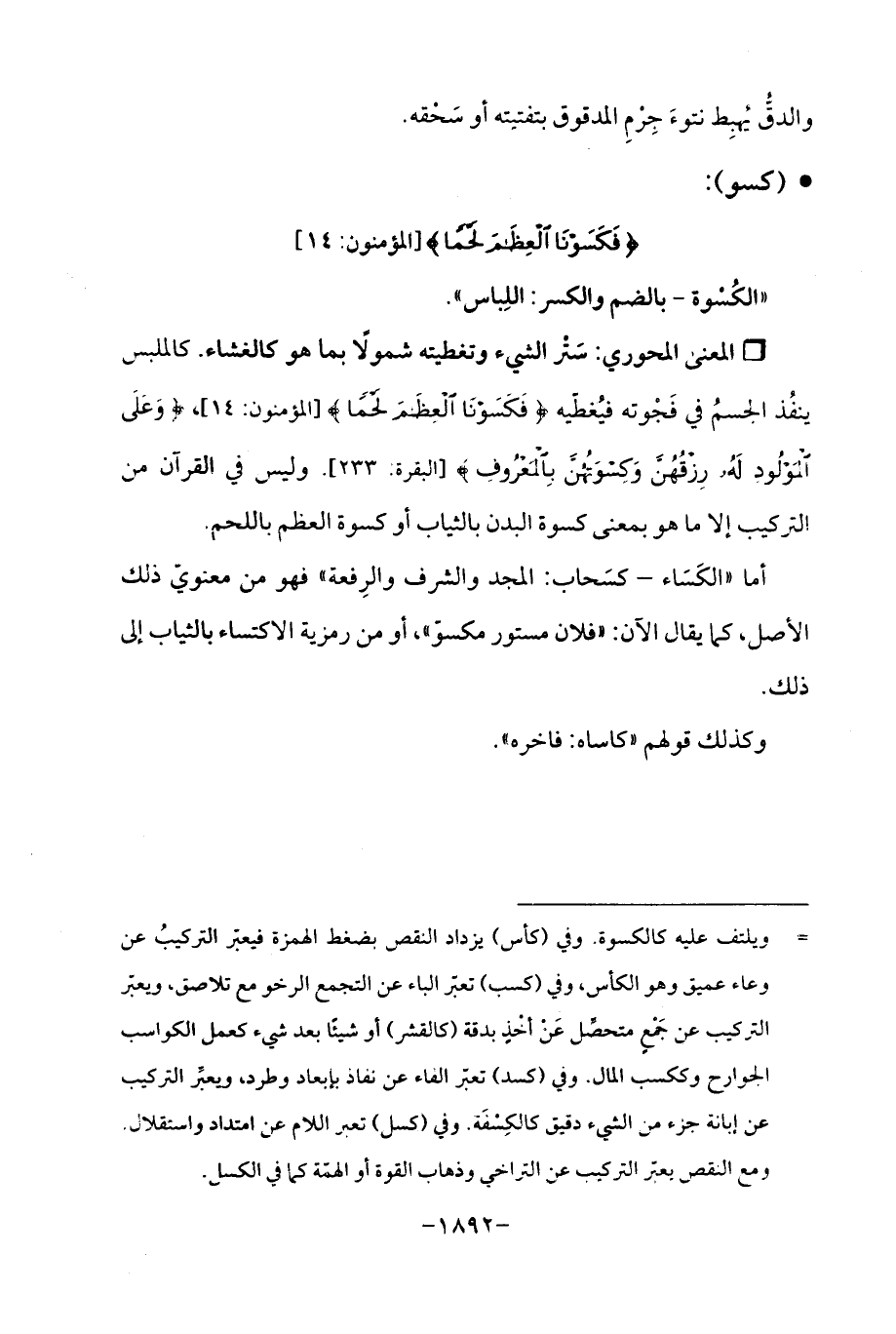 Qسَتْر الشيء وتغطيته شمولًا بما هو كالغشاء. كالملبس ينفُذ الجسمُ في فَجْوته فيُغطّيه {فَكَسَوْنَا الْعِظَامَ لَحْمًا} [المؤمنون: 14]، {وَعَلَى الْمَوْلُودِ لَهُ رِزْقُهُنَّ وَكِسْوَتُهُنَّ بِالْمَعْرُوفِ} [البقرة: 233]. وليس في القرآن من التركيب إلا ما هو بمعنى كسوة البدن بالثياب أو كسوة العظم باللحم.