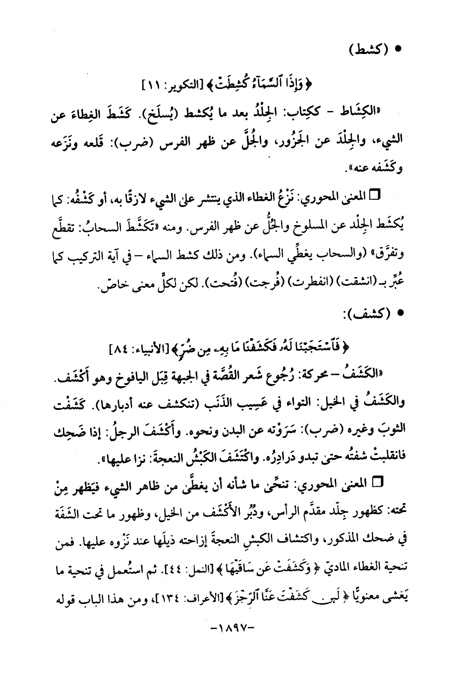 Qتنحِّي ما شأنه أن يغطَّى من ظاهر الشيء فيَظهر مِنْ تحته: كظهور جِلد مقدَّم الرأس، ودُبُر الأَكْشَف من الخيل، وظهور ما تحت الشَفَة في ضحك المذكور، واكتشاف الكبش النعجةَ إزاحته ذيلَها عند نَزْوه عليها. فمن تنحية الغطاء الماديّ {وَكَشَفَتْ عَنْ سَاقَيْهَا} [النمل: 44]. ثم استُعمل في تنحية ما يَغشى معنويًّا {لَئِنْ كَشَفْتَ عَنَّا الرِّجْزَ} [الأعراف: 134]، ومن هذا الباب قوله