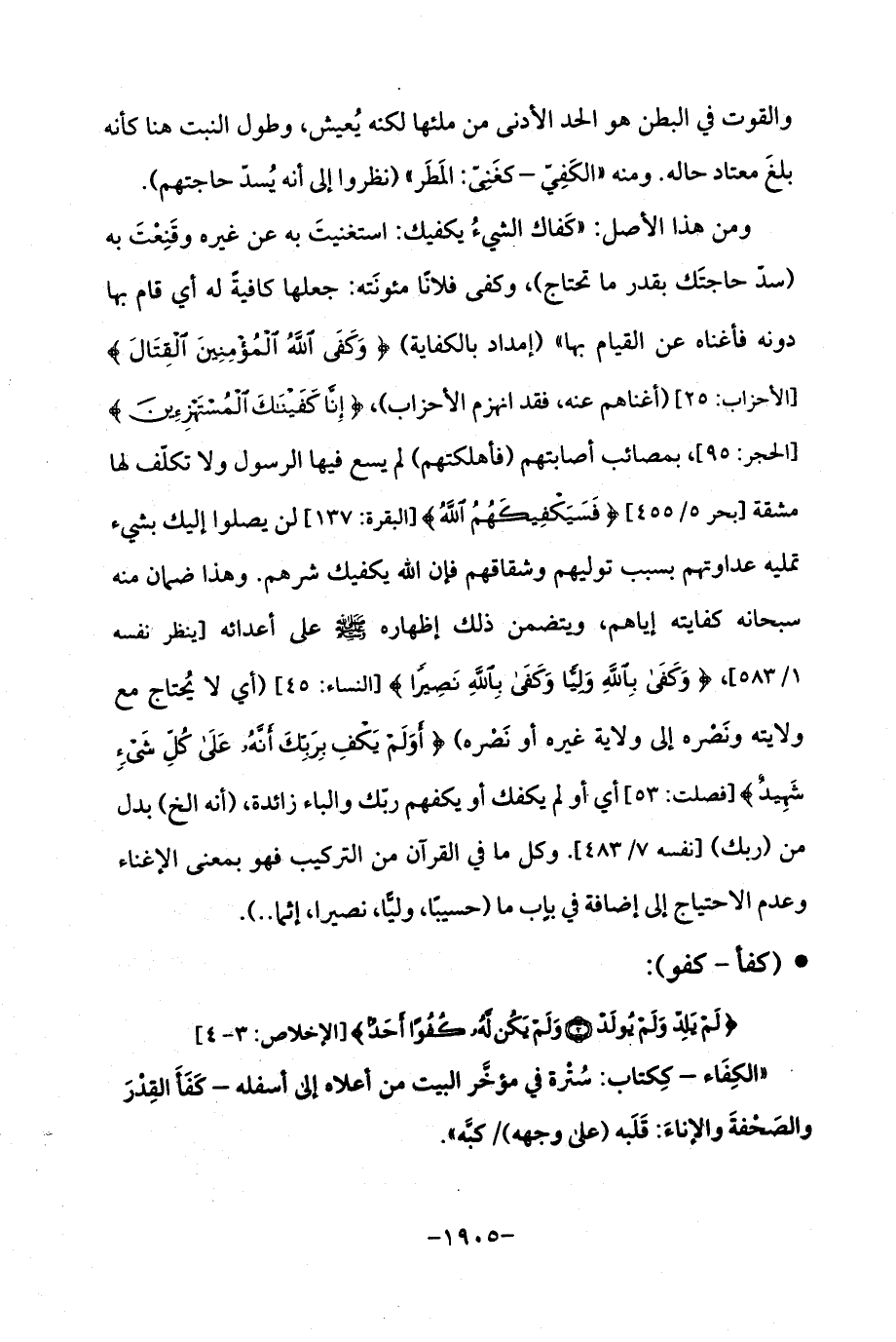 ومن هذا الأصل: "كَفاك الشيءُ يكفيك: استغنيتَ به عن غيره وقَنِعْتَ به (سدّ حاجتَك بقدر ما تحتاج)، وكفى فلانًا مئونَته: جعلها كافيةً له أي قام بها دونه فأغناه عن القيام بها " (إمداد بالكفاية) {وَكَفَى اللَّهُ الْمُؤْمِنِينَ الْقِتَالَ} [الأحزاب: 25] (أغناهم عنه، فقد انهزم الأحزاب)، {إِنَّا كَفَيْنَاكَ الْمُسْتَهْزِئِينَ} [الحجر: 95]، بمصائب أصابتهم (فأهلكتهم) لم يسع فيها الرسول ولا تكلّف لها مشقة [بحر 5/ 455] {فَسَيَكْفِيكَهُمُ اللَّهُ} [البقرة: 137] لن يصلوا إليك بشيء تمليه عداوتهم بسبب توليهم وشقاقهم فإن الله يكفيك شرهم. وهذا ضمان منه سبحانه كفايته إياهم، ويتضمن ذلك إظهاره - صلى الله عليه وسلم - على أعدائه [ينظر نفسه 1/ 583]، {وَكَفَى بِاللَّهِ وَلِيًّا وَكَفَى بِاللَّهِ نَصِيرًا} [النساء: 45] (أي لا يُحتاج مع ولايته ونَصْره إلى ولاية غيره أو نَصْره) {أَوَلَمْ يَكْفِ بِرَبِّكَ أَنَّهُ عَلَى كُلِّ شَيْءٍ شَهِيدٌ} [فصلت: 53] أي أو لم يكفك أو يكفهم ربّك والباء زائدة، (أنه الخ) بدل من (ربك) [نفسه 7/ 483]. وكل ما في القرآن من التركيب فهو بمعنى الإغناء وعدم الاحتياج إلي إضافة في بابٍ ما (حسيبًا، وليًّا، نصيرا، إثما ..).