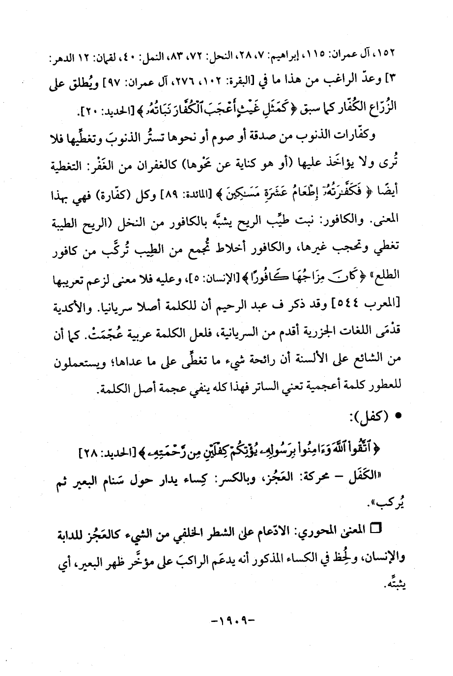 وكفّارات الذنوب من صدقة أو صوم أو نحوها تستُر الذنوبَ وتغطِّيها فلا تُرى ولا يؤاخَذ عليها (أو هو كناية عن مَحْوها) كالغفران من الغَفْر: التغطية أيضًا {فَكَفَّارَتُهُ إِطْعَامُ عَشَرَةِ مَسَاكِينَ} [المائدة: 89] وكل (كفّارة) فهي بهذا المعنى. والكافور: نبت طيِّب الريح يشبَّه بالكافور من النخل (الريح الطيبة تغطي وتحجب غيرها، والكافور أخلاط تُجمع من الطِيب تُركَّب من كافور الطلع " {كَانَ مِزَاجُهَا كَافُورًا} [الإنسان: 5]، وعليه فلا معنى لزعم تعريبها [المعرب 544] وقد ذكر ف عبد الرحيم أن للكلمة أصلا سريانيا. والأكدية قدْمَى اللغات الجزرية أقدم من السريانية، فلعل الكلمة عربية عُجّمَتْ. كما أن من الشائع على الألسنة أن رائحة شيء ما تغطِّى على ما عداها؛ ويستعملون للعطور كلمة أعجمية تعني الساتر فهذا كله ينفي عجمة أصل الكلمة.