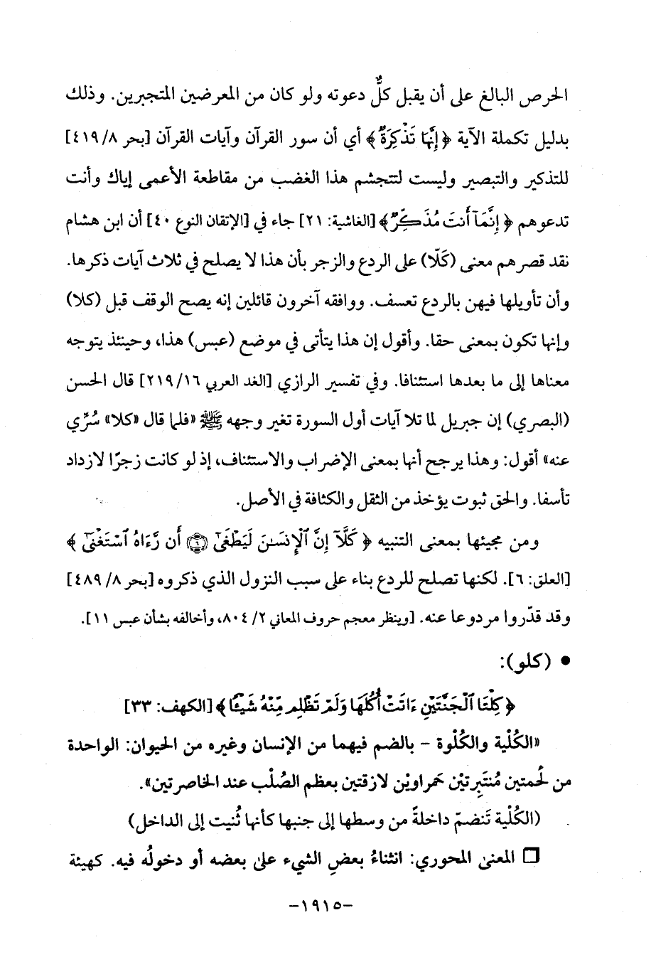 الحرص البالغ على أن يقبل كلٌّ دعوته ولو كان من المعرضين المتجبرين. وذلك بدليل تكملة الآية {إِنَّهَا تَذْكِرَةٌ} أي أن سور القرآن وآيات القرآن [بحر 8/ 419] للتذكير والتبصير وليست لتتجشم هذا الغضب من مقاطعة الأعمى إياك وأنت تدعوهم {إِنَّمَا أَنْتَ مُذَكِّرٌ} [الغاشية: 21] جاء في [الإتقان النوع 40] أن ابن هشام نقد قصرهم معنى (كَلّا) على الردع والزجر بأن هذا لا يصلح في ثلاث آيات ذكرها. وأن تأويلها فيهن بالردع تعسف. ووافقه آخرون قائلين إنه يصح الوقف قبل (كلا) وإنها تكون بمعنى حقا. وأقول إن هذا يتأتى في موضع (عبس) هذا، وحينئذ يتوجه معناها إلى ما بعدها استئنافا. وفي تفسير الرازي [الغد العربي 16/ 219] قال الحسن (البصري) إن جبريل لما تلا آيات أول السورة تغير وجهه - صلى الله عليه وسلم - "فلما قال "كلا "سُرِّي عنه "أقول: وهذا يرجح أنها بمعنى الإضراب والاستئناف، إذ لو كانت زجرًا لازداد تأسفا. والحق ثبوت يؤخذ من الثقل والكثافة في الأصل.