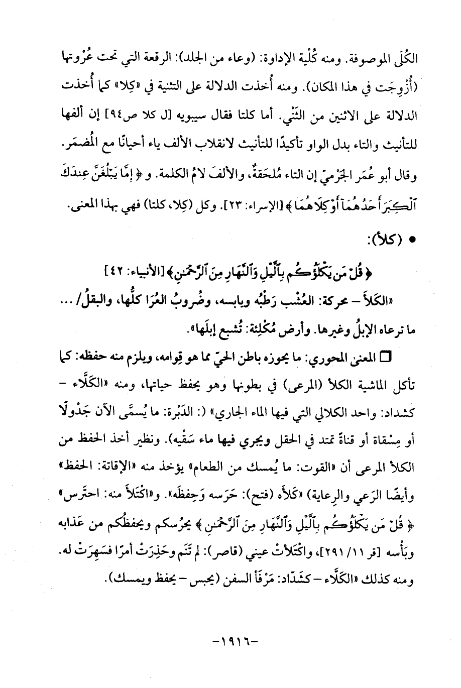 الكُلَى الموصوفة. ومنه كُلْية الإداوة: (وعاء من الجلد): الرقعة التي تحت عُرْوتها (أُزْوِجَت في هذا المكان). ومنه أُخذت الدلالة على التثنية في "كِلا "كما أُخذت الدلالة على الاثنين من الثَنْي. أما كلتا فقال سيبويه [ل كلا ص 94] إن ألفها للتأنيث والتاء بدل الواو تأكيدًا للتأنيث لانقلاب الألف ياء أحيانًا مع المُضمَر. وقال أبو عُمَر الجَرْميّ إن التاء مُلحَقةٌ، والألفَ لامُ الكلمة. و {إِمَّا يَبْلُغَنَّ عِنْدَكَ الْكِبَرَ أَحَدُهُمَا أَوْ كِلَاهُمَا} [الإسراء: 23]. وكل (كِلا، كلتا) فهي بهذا المعنى.