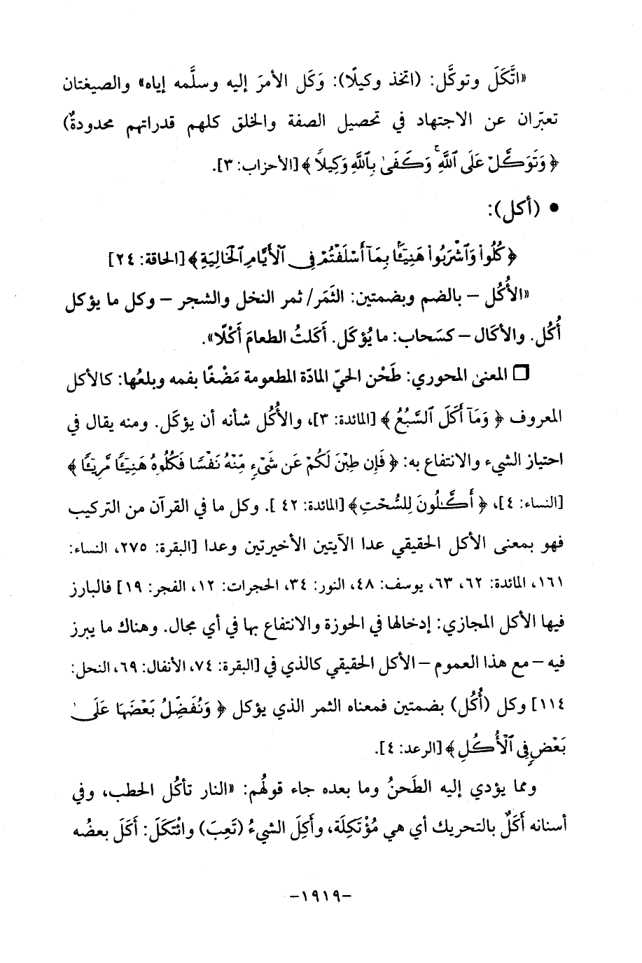 Qطَحْن الحيّ المادّة المطعومة مَضْغًا بفمه وبلعُها: كالأكل المعروف {وَمَا أَكَلَ السَّبُعُ} [المائدة: 3]، والأُكُل شأنه أن يؤكَل. ومنه يقال في احتياز الشيء والانتفاع به: {فَإِنْ طِبْنَ لَكُمْ عَنْ شَيْءٍ مِنْهُ نَفْسًا فَكُلُوهُ هَنِيئًا مَرِيئًا} [النساء: 4]، {أَكَّالُونَ لِلسُّحْتِ} [المائدة: 42]. وكل ما في القرآن من التركيب فهو بمعنى الأكل الحقيقي عدا الآيتين الأخيرتين وعدا [البقرة: 275، النساء: 161، المائدة: 62، 63، يوسف: 48، النور: 34، الحجرات: 12، الفجر: 19] فالبارز فيها الأكل المجازي: إدخالها في الحوزة والانتفاع بها في أي مجال. وهناك ما يبرز فيه - مع هذا العموم - الأكل الحقيقي كالذي في [البقرة: 74، الأنفال: 69، النحل: 114] وكل (أُكُل) بضمتين فمعناه الثمر الذي يؤكل {وَنُفَضِّلُ بَعْضَهَا عَلَى بَعْضٍ فِي الْأُكُلِ} [الرعد: 4].