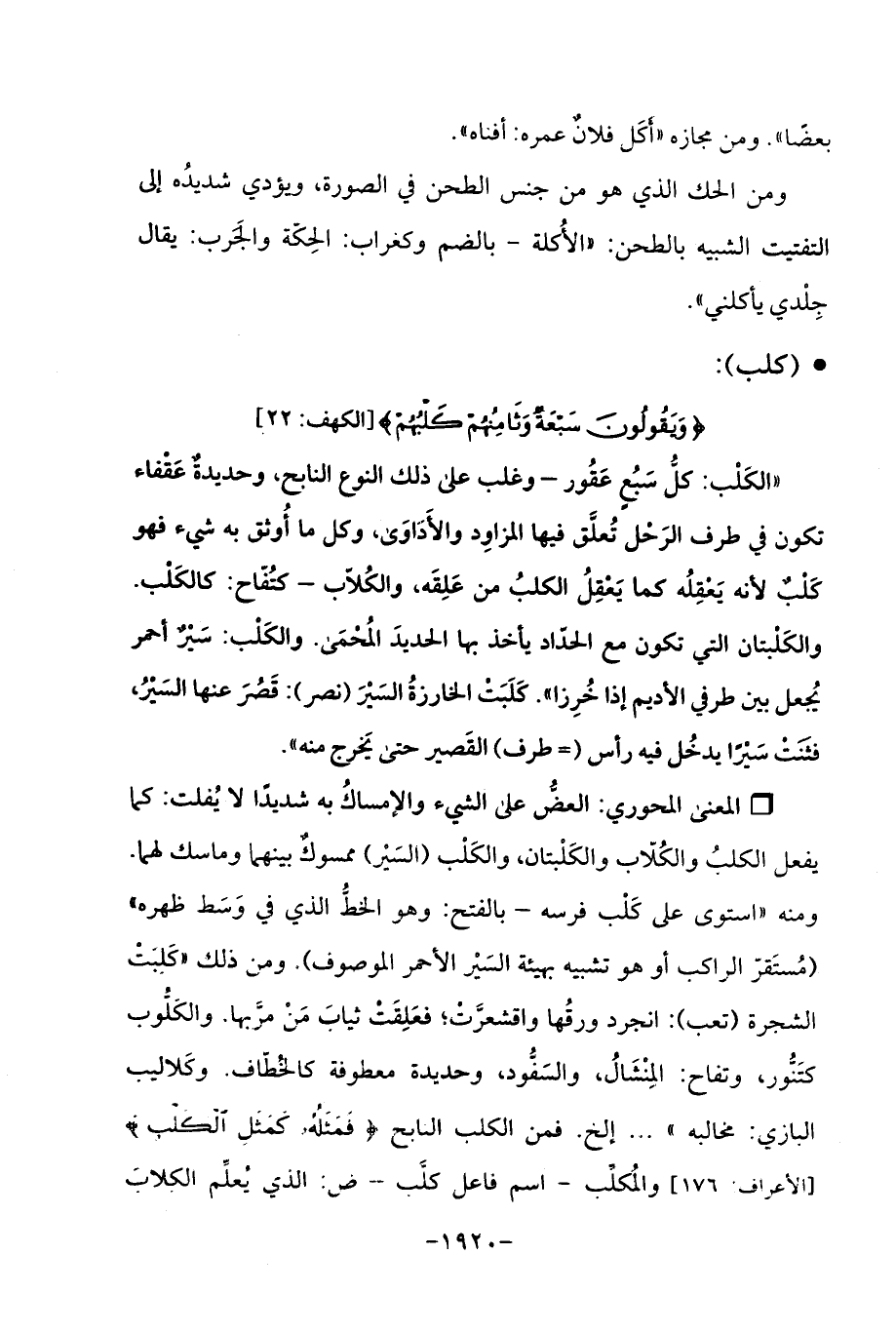 Qالعضُّ على الشيء والإمساكُ به شديدًا لا يُفلت: كما يفعل الكلبُ والكُلّاب والكَلْبتان، والكَلْب (السَيْر) ممسوكٌ بينهما وماسك لهما. ومنه "استوى على كَلْب فرسه - بالفتح: وهو الخطُّ الذي في وَسَط ظهره " (مُستَقرّ الراكب أو هو تشبيه بهيئة السَيْر الأحمر الموصوف). ومن ذلك "كَلِبتْ الشجرة (تعب): انجرد ورقُها واقشعرَّتْ؛ فعَلِقَتْ ثيابَ مَنْ مرَّ بها. والكَلُّوب كتَنُّور، وتفاح: المِنْشَالُ، والسَفُّود، وحديدة معطوفة كالخُطّاف. وكَلاليب البازَي: مخالبه " ... إلخ. فمن الكلب النابح {فَمَثَلُهُ كَمَثَلِ الْكَلْبِ} [الأعراف: 176] والمُكلِّب- اسم فاعل كلَّب - ض: الذي يُعلِّم الكلابَ