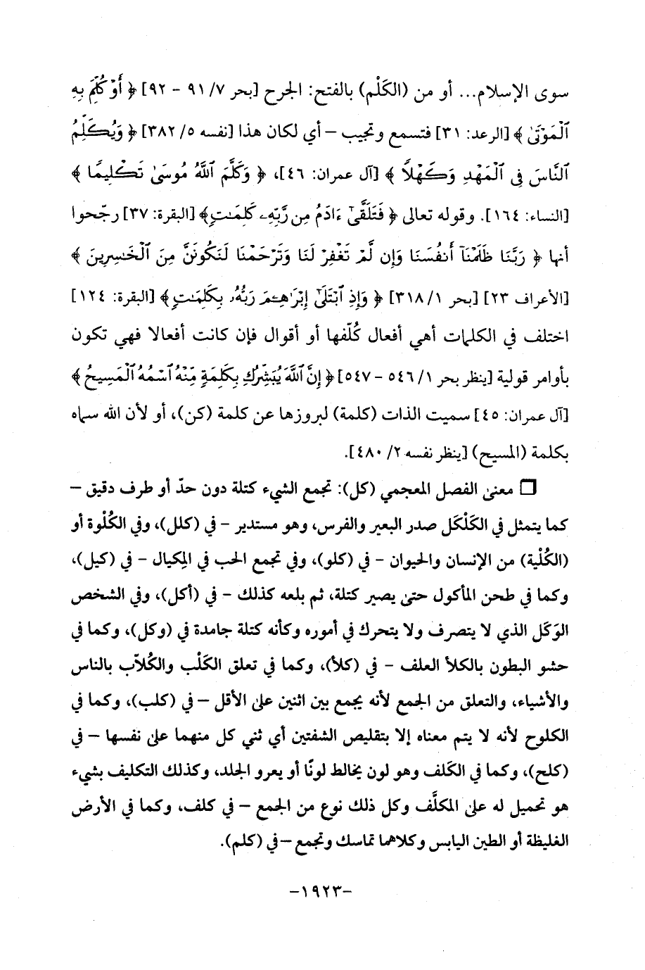سوى الإسلام ... أو من (الكَلْم) بالفتح: الجرح [بحر 7/ 91 - 92] {أَوْ كُلِّمَ بِهِ الْمَوْتَى} [الرعد: 31] فتسمع وتجيب - أي لكان هذا [نفسه 5/ 382] {وَيُكَلِّمُ النَّاسَ فِي الْمَهْدِ وَكَهْلًا} [آل عمران: 46]، {وَكَلَّمَ اللَّهُ مُوسَى تَكْلِيمًا} [النساء: 164]. وقوله تعالى {فَتَلَقَّى آدَمُ مِنْ رَبِّهِ كَلِمَاتٍ} [البقرة: 37] رجّحوا أنها {رَبَّنَا ظَلَمْنَا أَنْفُسَنَا وَإِنْ لَمْ تَغْفِرْ لَنَا وَتَرْحَمْنَا لَنَكُونَنَّ مِنَ الْخَاسِرِينَ} [الأعراف: 23] [بحر 1/ 318] {وَإِذِ ابْتَلَى إِبْرَاهِيمَ رَبُّهُ بِكَلِمَاتٍ} [البقرة: 124] اختلف في الكلمات أهي أفعال كُلّفها أو أقوال فإن كانت أفعالا فهي تكون بأوامر قولية [ينظر بحر 1/ 546 - 547] {إِنَّ اللَّهَ يُبَشِّرُكِ بِكَلِمَةٍ مِنْهُ اسْمُهُ الْمَسِيحُ} [آل عمران: 45] سميت الذات (كلمة) لبروزها عن كلمة (كن)، أو لأن الله سماه بكلمة (المسيح) [ينظر نفسه 2/ 480].