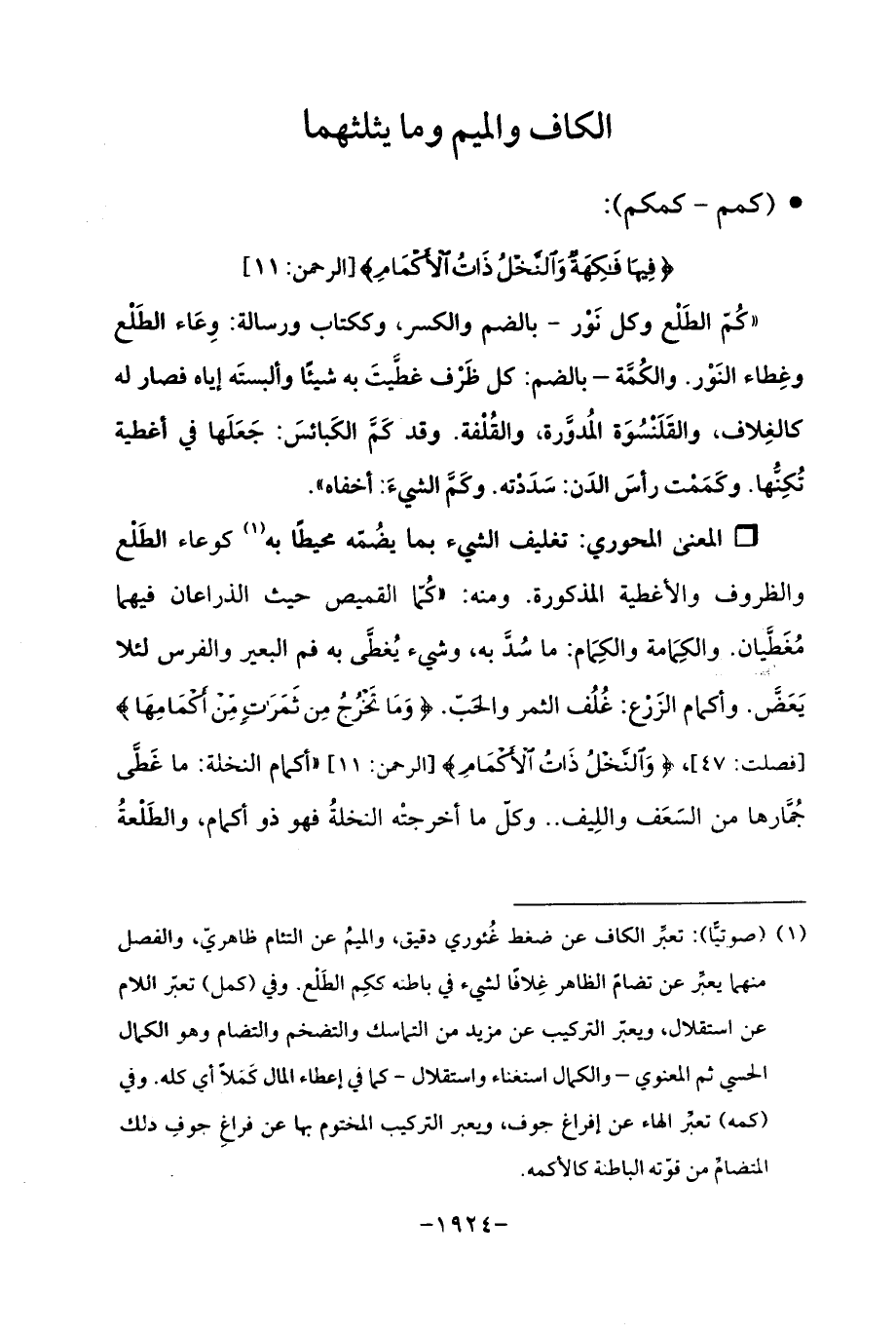(¬1) (صوتيًّا): تعبِّر الكاف عن ضغط غُئوري دقيق، والميمُ عن التئام ظاهريّ، والفصل منهما يعبِّر عن تضامّ الظاهر غِلافًا لشيء في باطنه ككِم الطَلْع. وفي (كمل) تعبّر اللام عن استقلال، ويعبّر التركيب عن مزيد من التماسك والتضخم والتضام وهو الكمال الحسي ثم المعنوي - والكمال استغاء واستقلال - كما في إعطاء المال كَمَلًا أي كله. وفي (كمه) تعبِّر الهاء عن إفراغ جوف، ويعبر التركيب المختوم بها عن فراغِ جوفِ ذلك المتضامِّ من قوّته الباطنة كالأكمه.